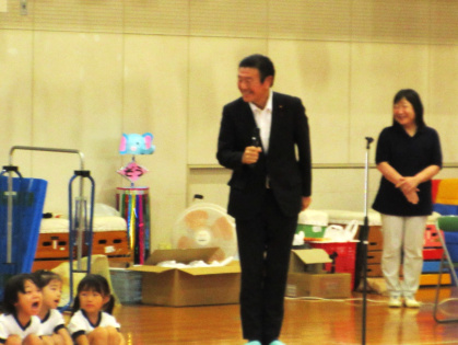 開会式では、園長T、オーナーである松井市議からのご挨拶をいただきました。そして、みんなで『うんどうかいのうた』を元気に歌い、準備体操『ディズニー体操』をしました。