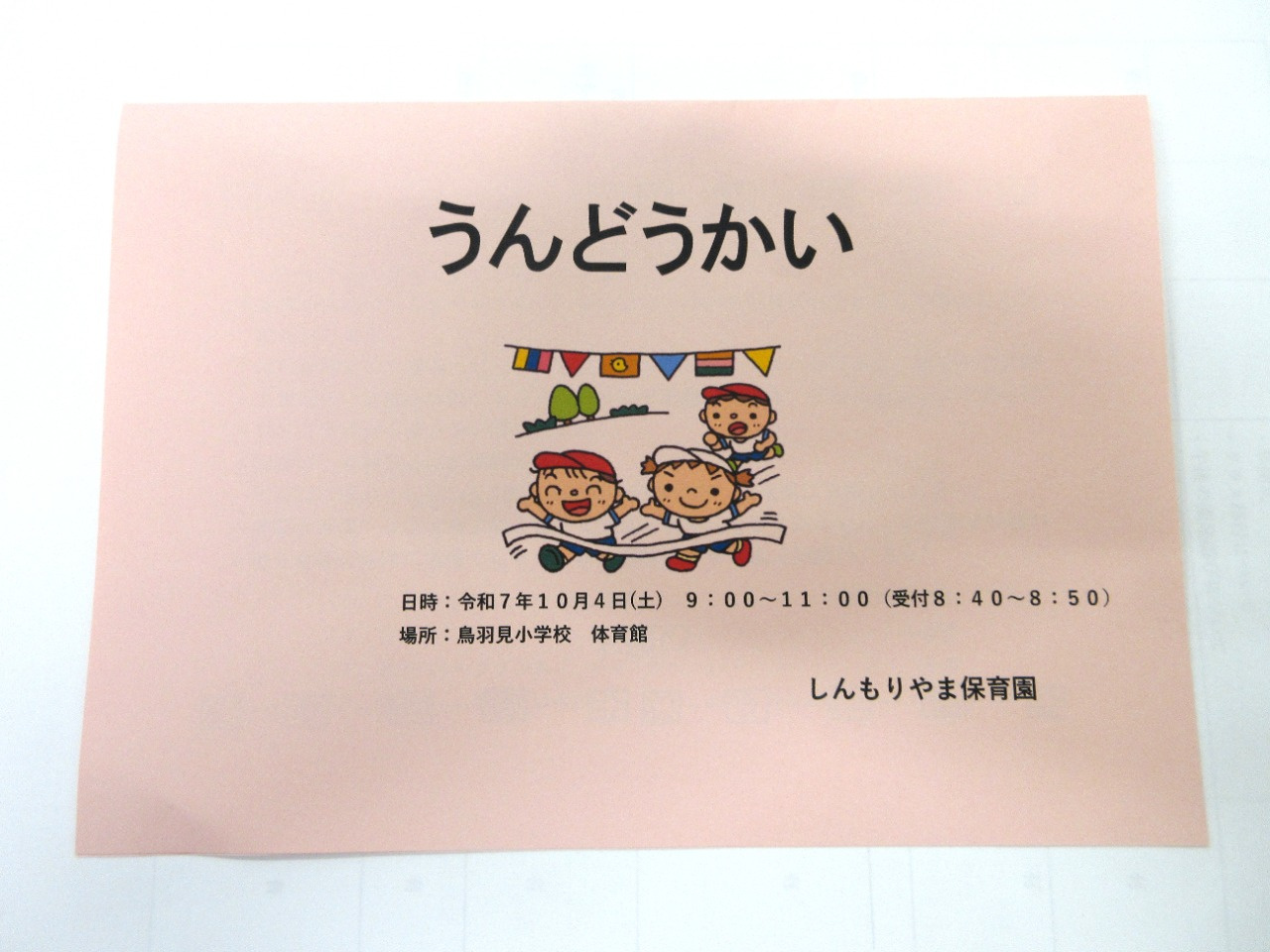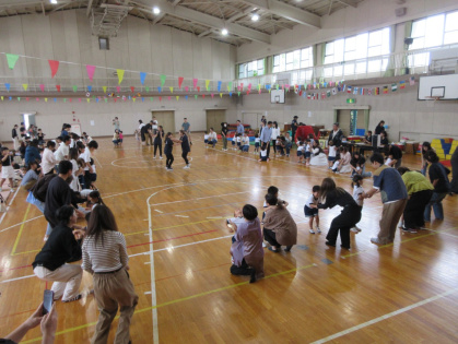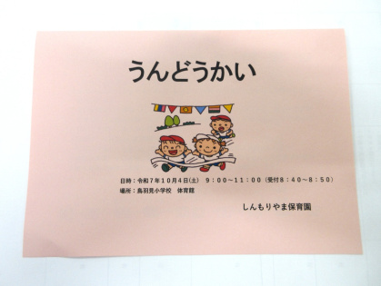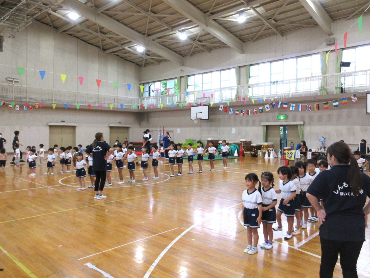 10月5日(土)、鳥羽見小学校の体育館でしんもりやま保育園の運動会が行われました。生憎の天気でしたが子ども達は元気いっぱい!笑顔いっぱい!今年度も、幼児クラス(3歳児ぱんだ組・4歳児きりん組・5歳児ぞう組)と2歳児うさぎ組が参加しました。新型コロナウイルス感染症は5類にはなりましたが、今年度も保護者の方は一家族2名まで、兄姉の方は小学3年生までの参観とさせていただきました。ご理解、ご協力をありがとうございました。