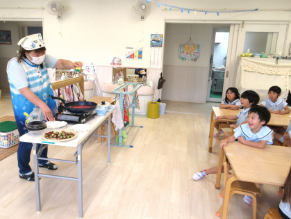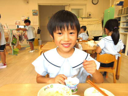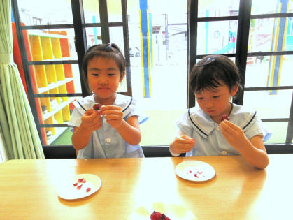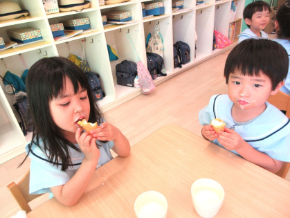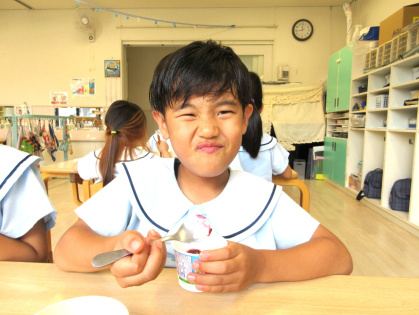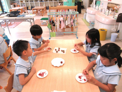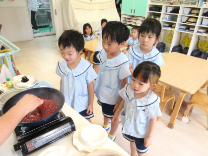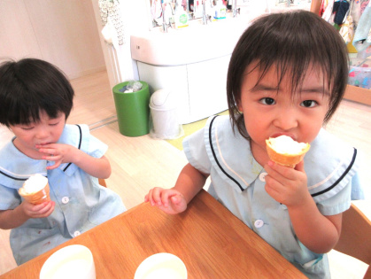 2025年10月08日(水) イベント報告 < お知らせ 「運動会がんばったね!」&「食欲の秋」に突入しました。(幼児クラス) 10月6日(月)、午後のおやつでコーンにのったアイスを「いただきまーす!」 10月7日(火)、5歳児クラスぞう組は、園長Tと一緒に「ローゼルジャム」を作りました。給食のデザート、ヨーグルトにかけて頂きました。4歳児クラスきりん組さんにもお裾分けしました。 園庭の畑のローゼルが実ったら、又、作ろうね。