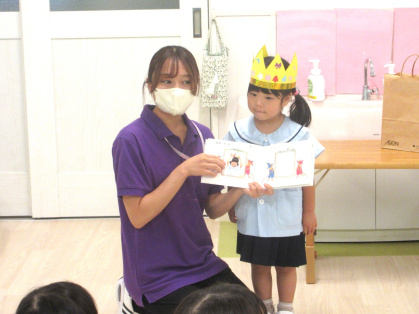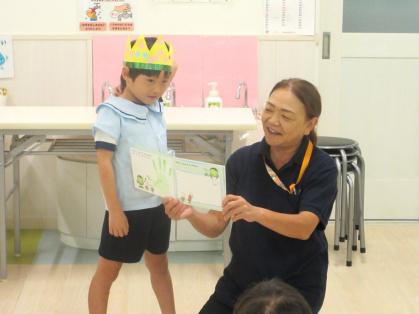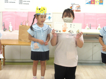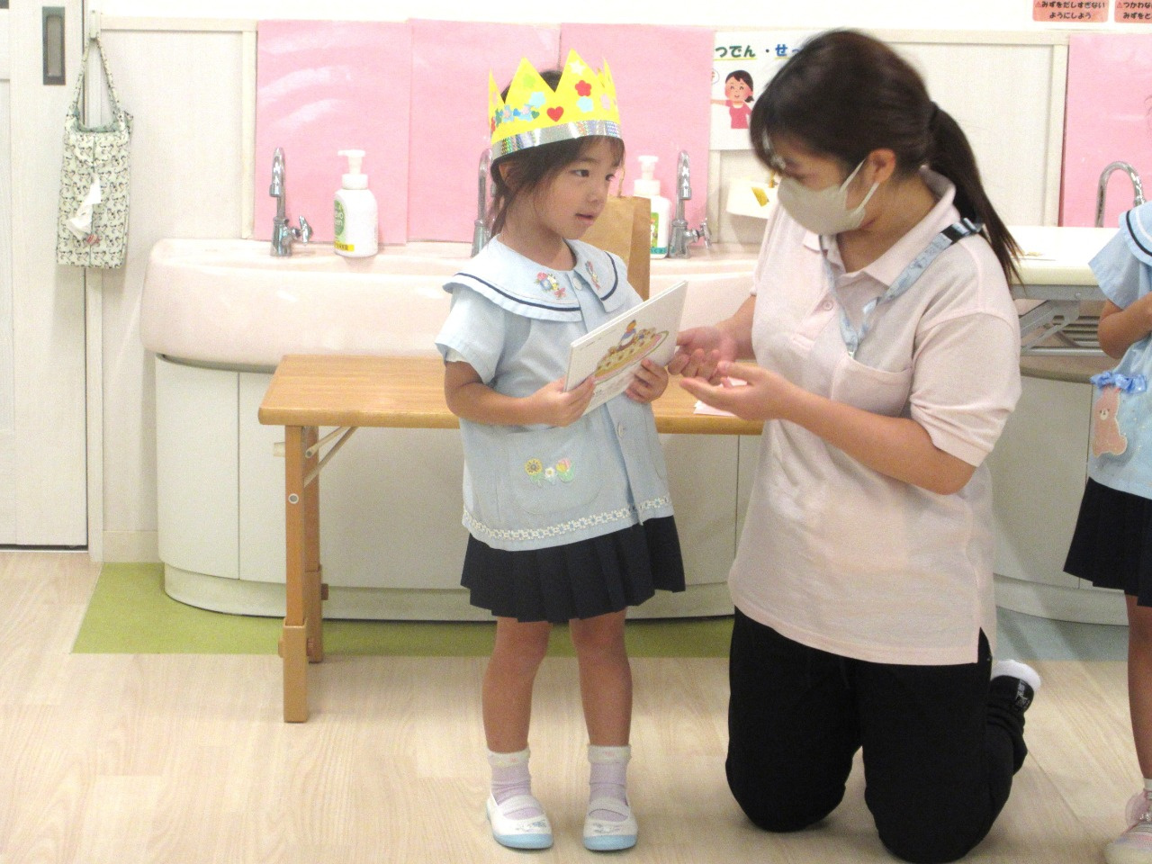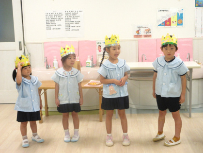 10月21日(火)、幼児クラスで10月の誕生会を行い、2歳児うさぎ組さんも一緒にお祝いをしてくれました。今月は、3歳児ぱんだ組1名、4歳児きりん組2名、5歳児ぞう組1名のお友達が一つずつ大きくなりました。司会の先生から「10月生まれのお友達は誰ですか?」の声掛けに、少しドキドキしながらも皆嬉しそうに前に出てきていました。インタビューでは、司会の先生からキノコカードを一人一人引き、その中に書いてある質問に答えました。皆からは「誕生日の歌」のプレゼントと担任の先生から誕生日絵本をプレゼントしてもらいました。