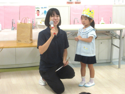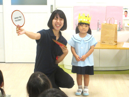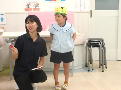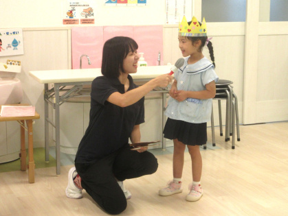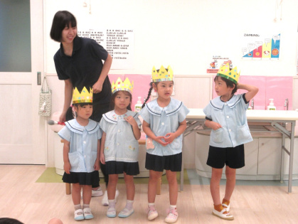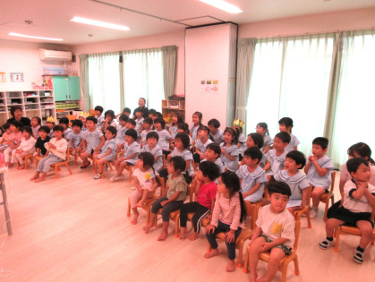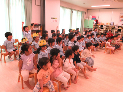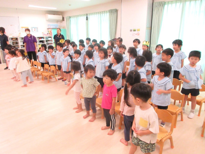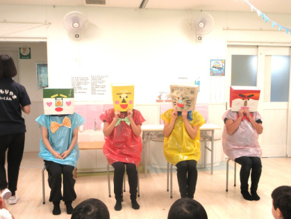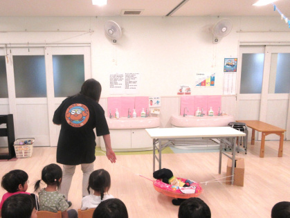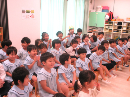 先生からの出し物は「わたしは誰でしょうクイズ」を見ました。好きな食べ物やキャラクターなどのヒントを元に、先生は誰なのか想像しながら当てるゲームです。先生達がお面を被って登場すると「だれ~?」と、皆ワクワク!先生達の好きなものを聞いたり、先生と腕相撲をするうちに「わかったー!○○せんせいじゃない?」と、皆大正解!とても楽しんでいました。最後は、皆で今月の歌「きのこ」を元気に歌いました。
