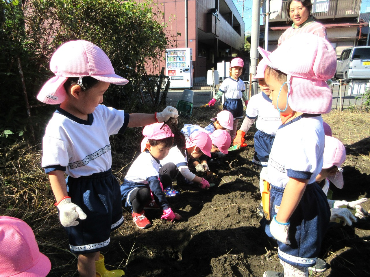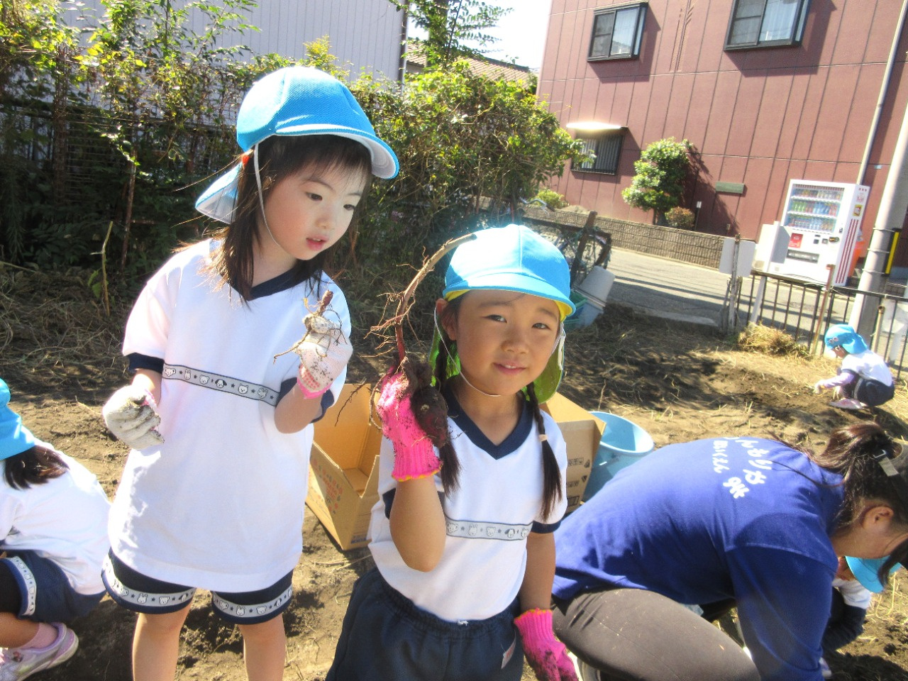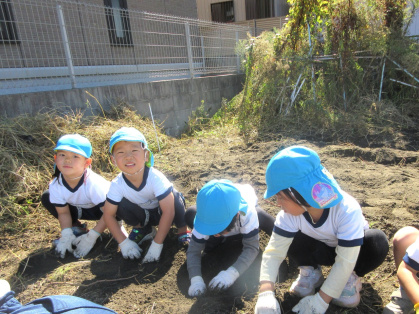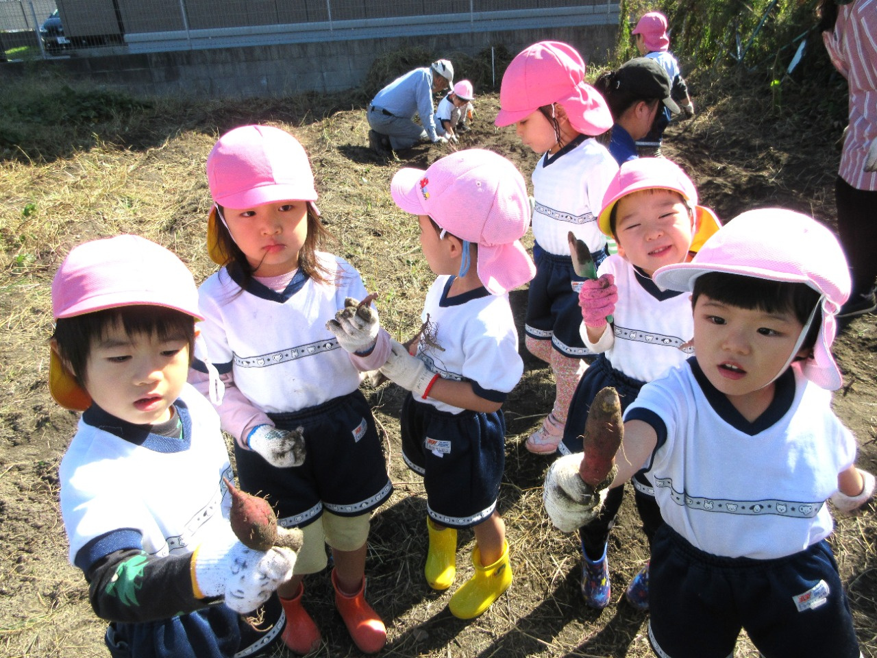 幼児クラス(3歳児ぱんだ組・4歳児きりん組・5歳児ぞう組)は、今年も田邊様の畑で芋掘りをさせていただきました。まず初めに「おはようございます」「よろしくおねがいします」と、元気にご挨拶をしました。芋の掘り方を教えていただいた後、皆で掘り始めました。今年は、猛暑による影響からか不作でしたが、「ちっちゃくて かわいい!」や「おいもがみえた!てつだって~」など、友達と協力して芋掘りを楽しんでいました。