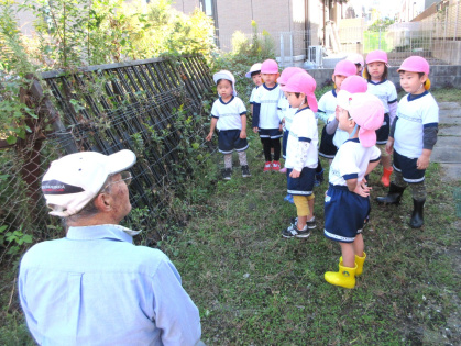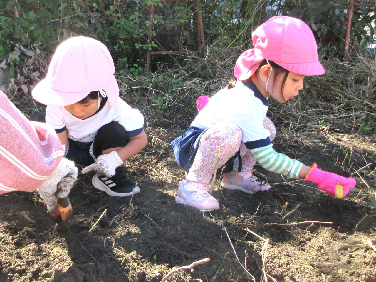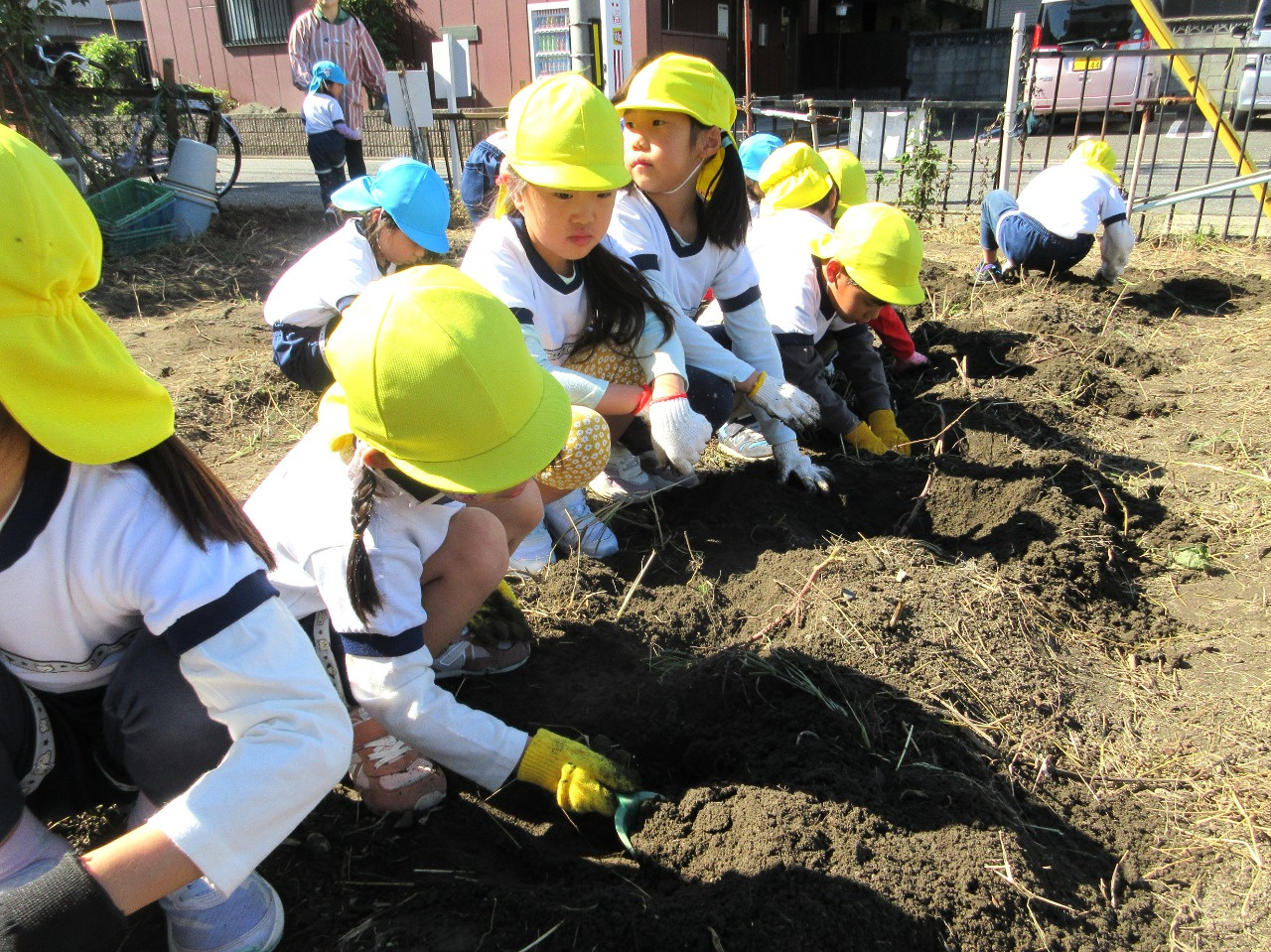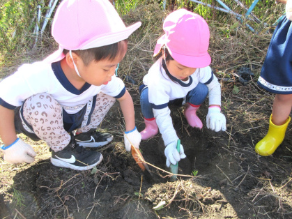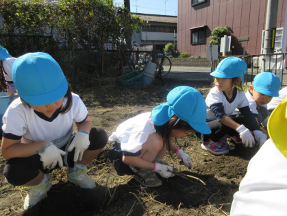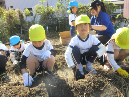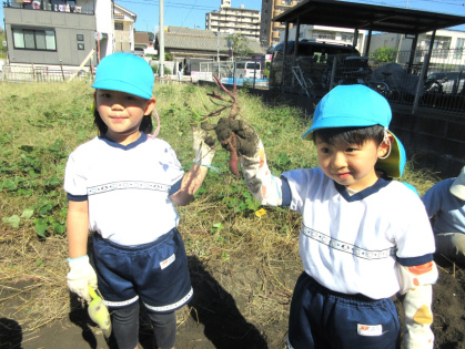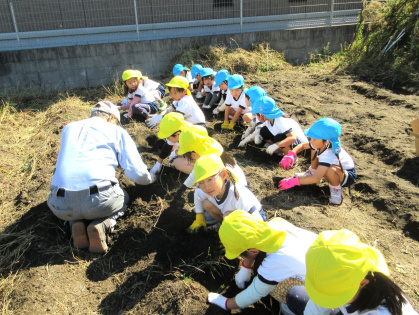 幼児クラス(3歳児ぱんだ組・4歳児きりん組・5歳児ぞう組)は、今年も田邊様の畑で芋掘りをさせていただきました。まず初めに「おはようございます」「よろしくおねがいします」と、元気にご挨拶をしました。芋の掘り方を教えていただいた後、皆で掘り始めました。今年は、猛暑による影響からか不作でしたが、「ちっちゃくて かわいい!」や「おいもがみえた!てつだって~」など、友達と協力して芋掘りを楽しんでいました。