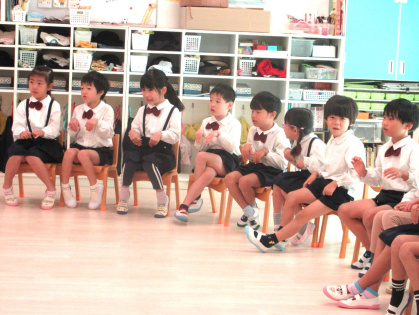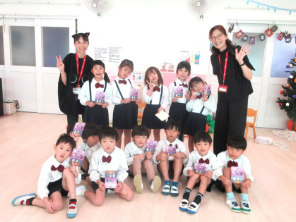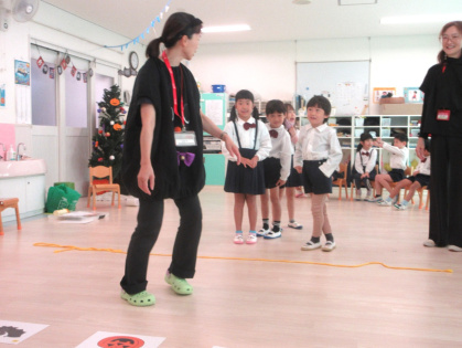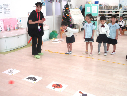 ハロウィンに因んだカボチャ・コウモリ・魔女などの言葉を教えていただき、ゲームをしたり踊ったりと、とても楽しそうでした。最後は、一人ずつ「Trick or Treat!」と言い、ハロウィンのシールをいただき、皆で記念写真を撮りました。