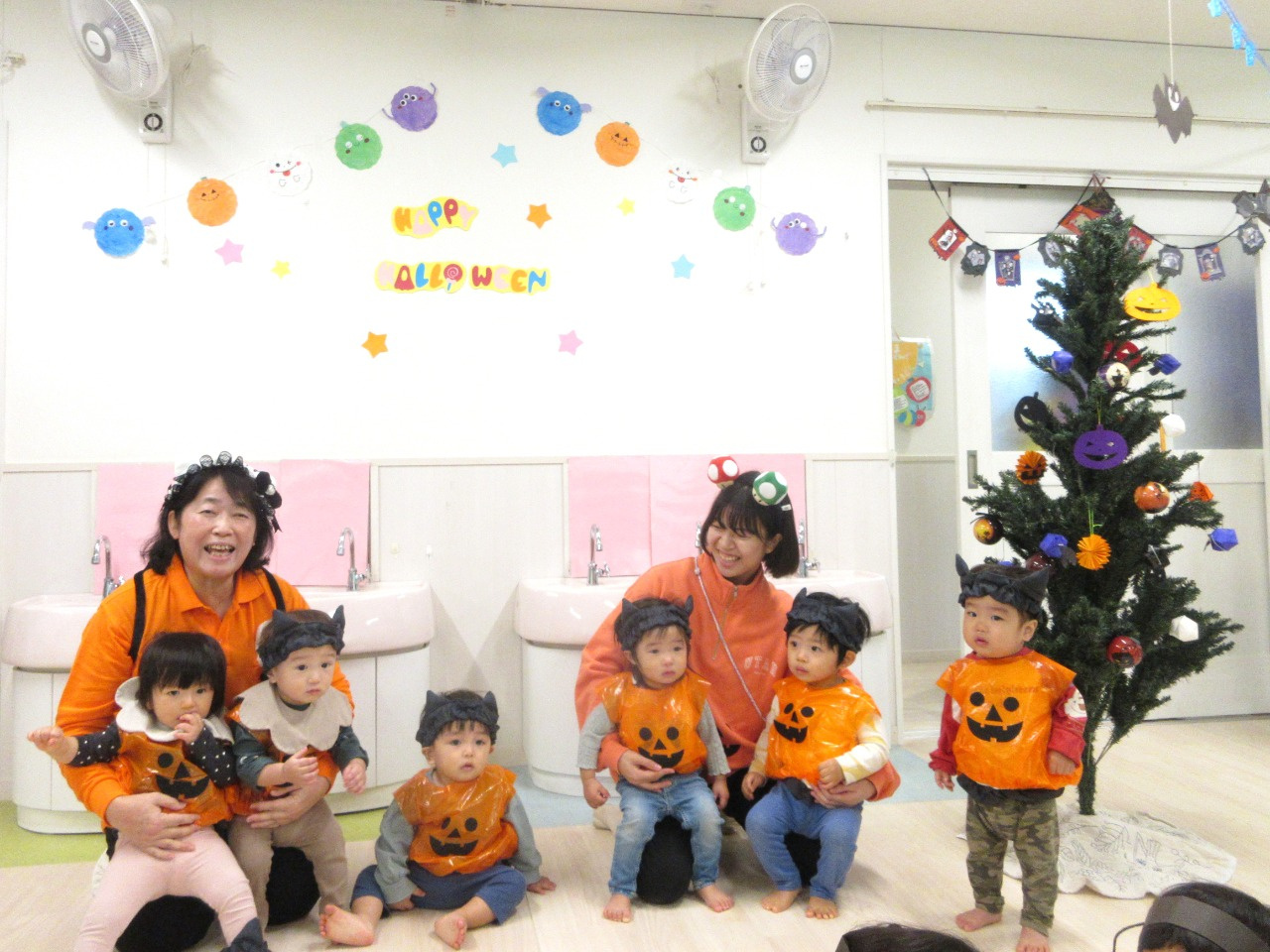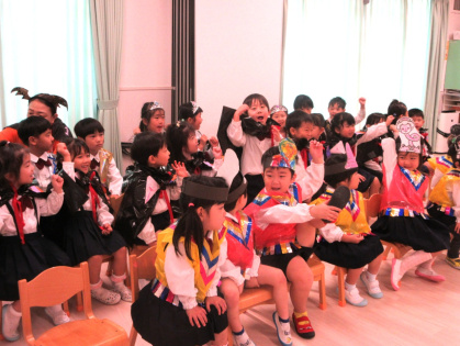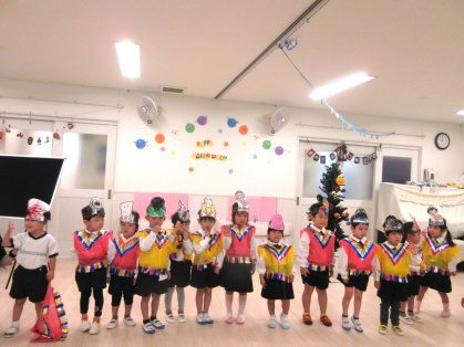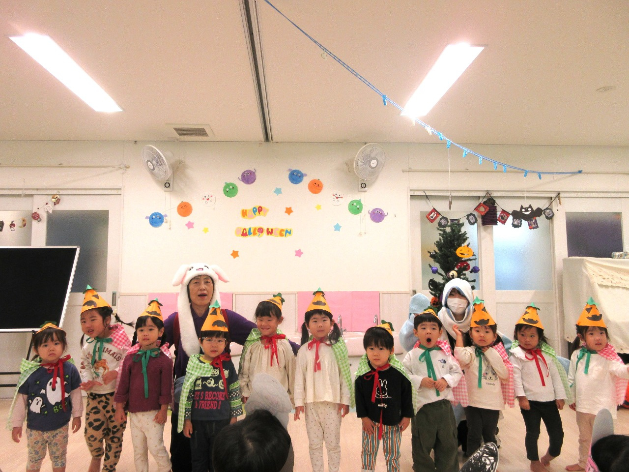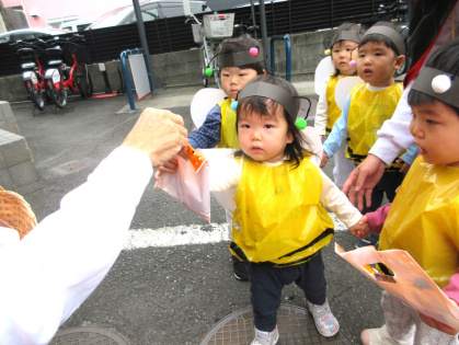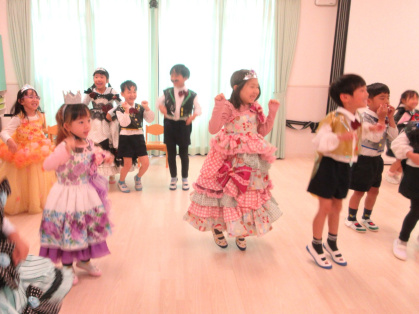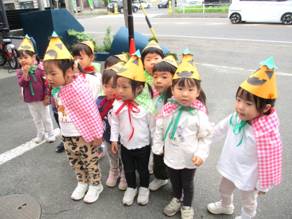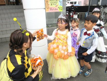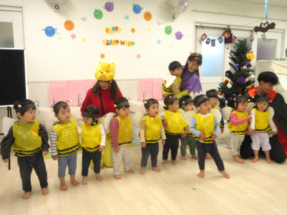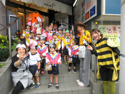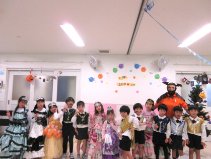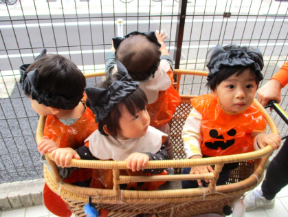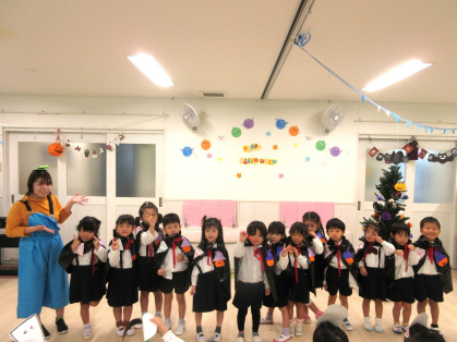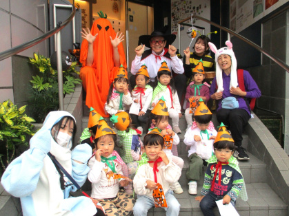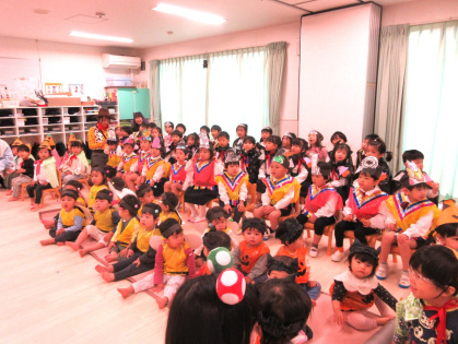 10月31日(金)、乳児クラス(0歳児ひよこ組・1歳児りす組・2歳児うさぎ組)と幼児クラス(3歳児ぱんだ組・4歳児きりん組・5歳児ぞう組)の皆でハロウィンパーティーを行いました。各クラスそれぞれ衣装を身に着けて仮装し、皆に披露しました。