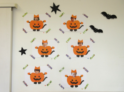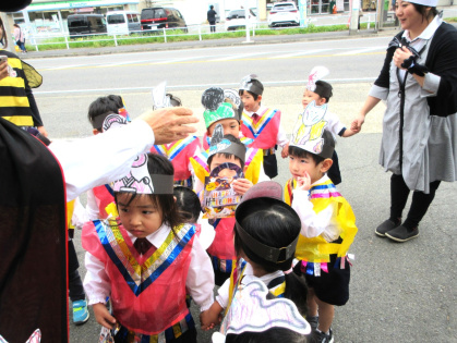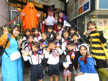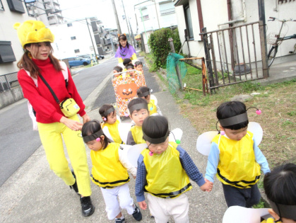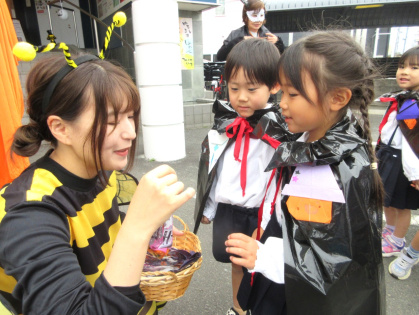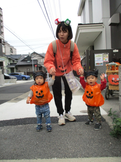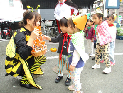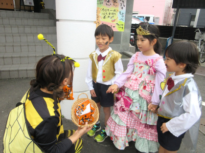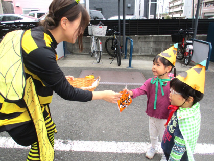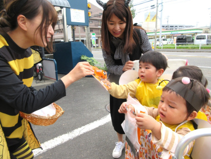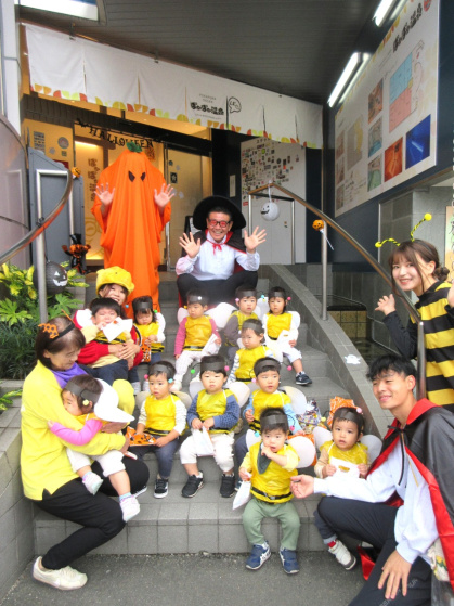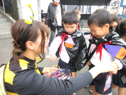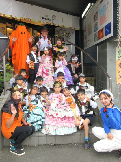 ハロウィンについての話&クイズをしたり、皆で「グーチョキパーでパンプキン」を踊った後は、ぽかぽか温泉へ出発!ぽかぽか温泉に着くと、かぼちゃおばけとドラキュラとミツバチが出迎えてくれました。ちょっぴり恥ずかしそうにする子もいましたが「トリック・オア・トリート」と言うとお菓子をくれました。皆、とても嬉しそうでした。
