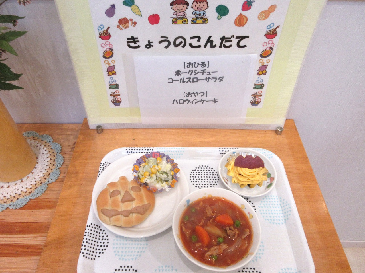 今日の給食とおやつは、ハロウィン特別メニューでした!カボチャのパンやハロウィンケーキに皆、大喜びで食べていました。