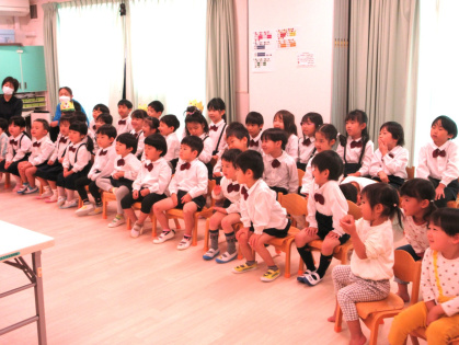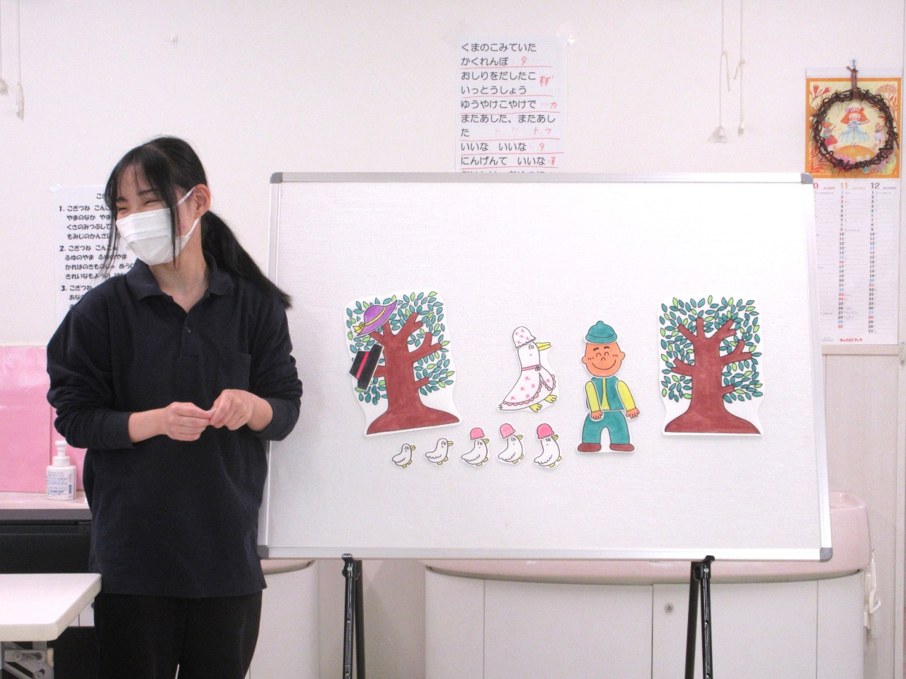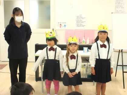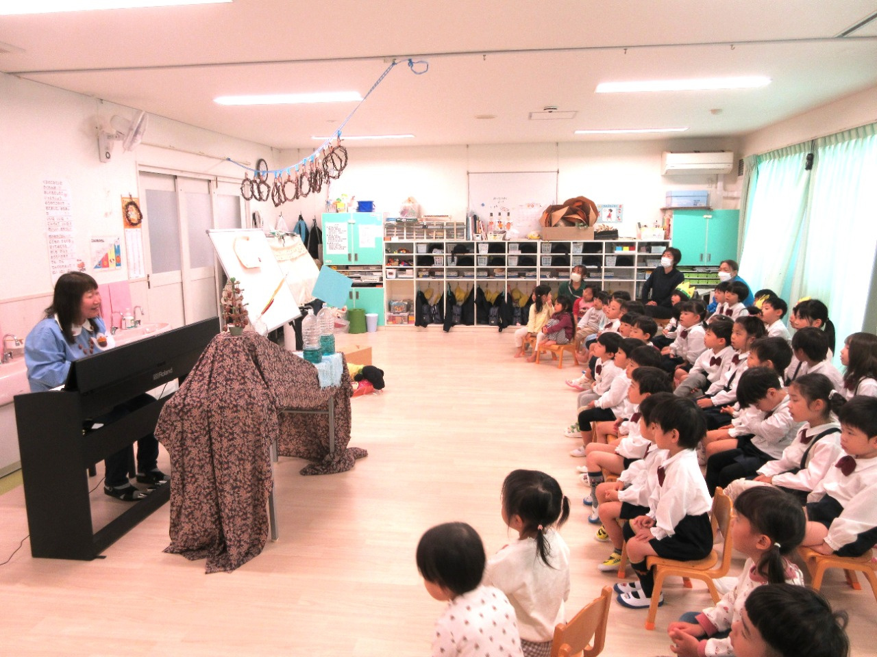 先生からの出し物は、パネルシアター「すてきな帽子屋さん」を見ました。森の中にある帽子屋さんにウサギやゾウ、アヒルの親子達が帽子を探しにやってきました。帽子屋さんは、歌を歌いながら動物たちにぴったりの帽子を用意してくれました。お客さんは気に入った帽子を見つけて大満足!お店に並ぶ帽子を見て、どんなお客さんが来るか子ども達もワクワクしながら楽しく見ていました。
