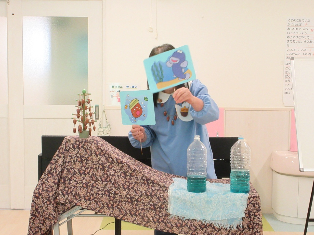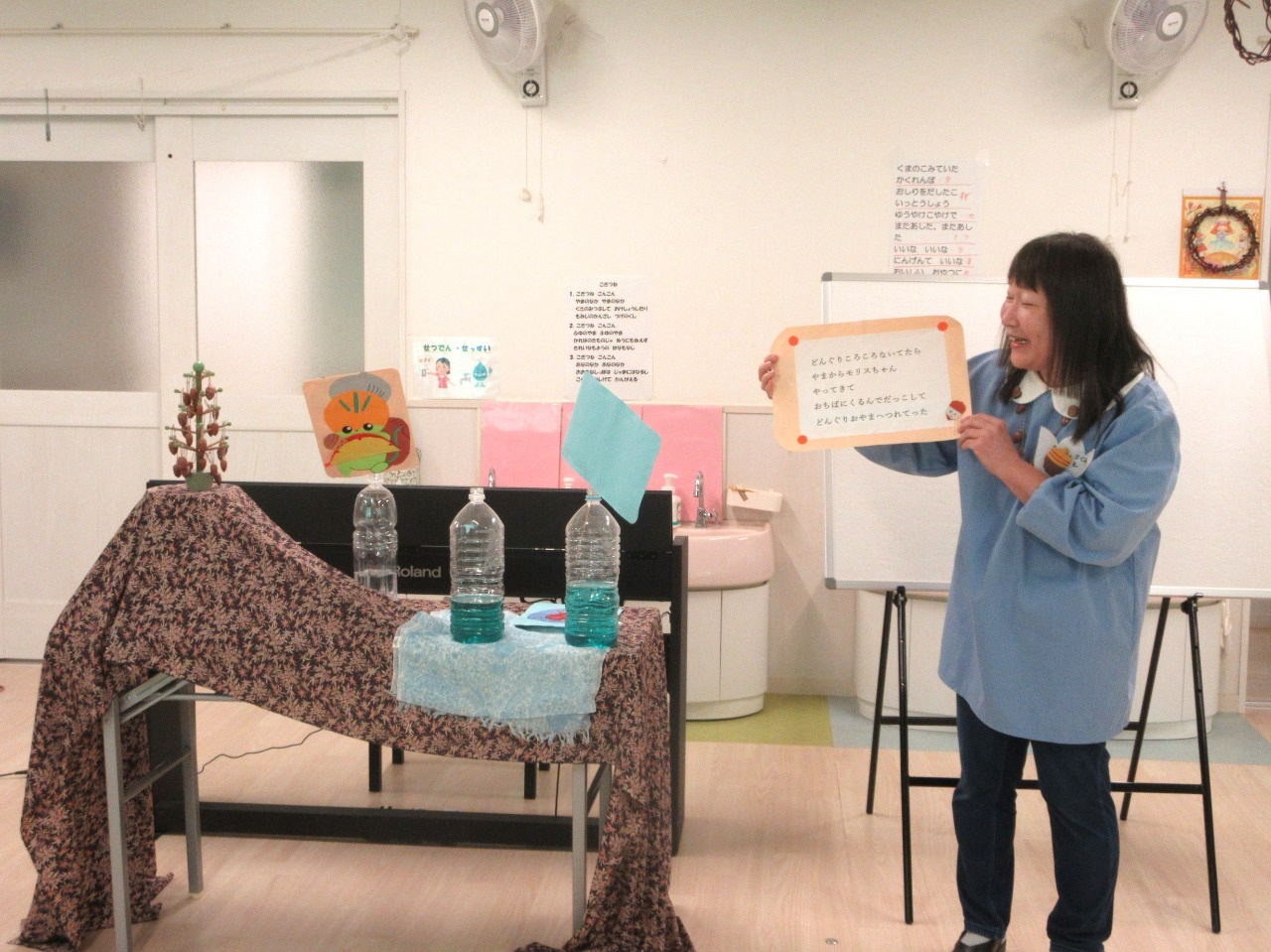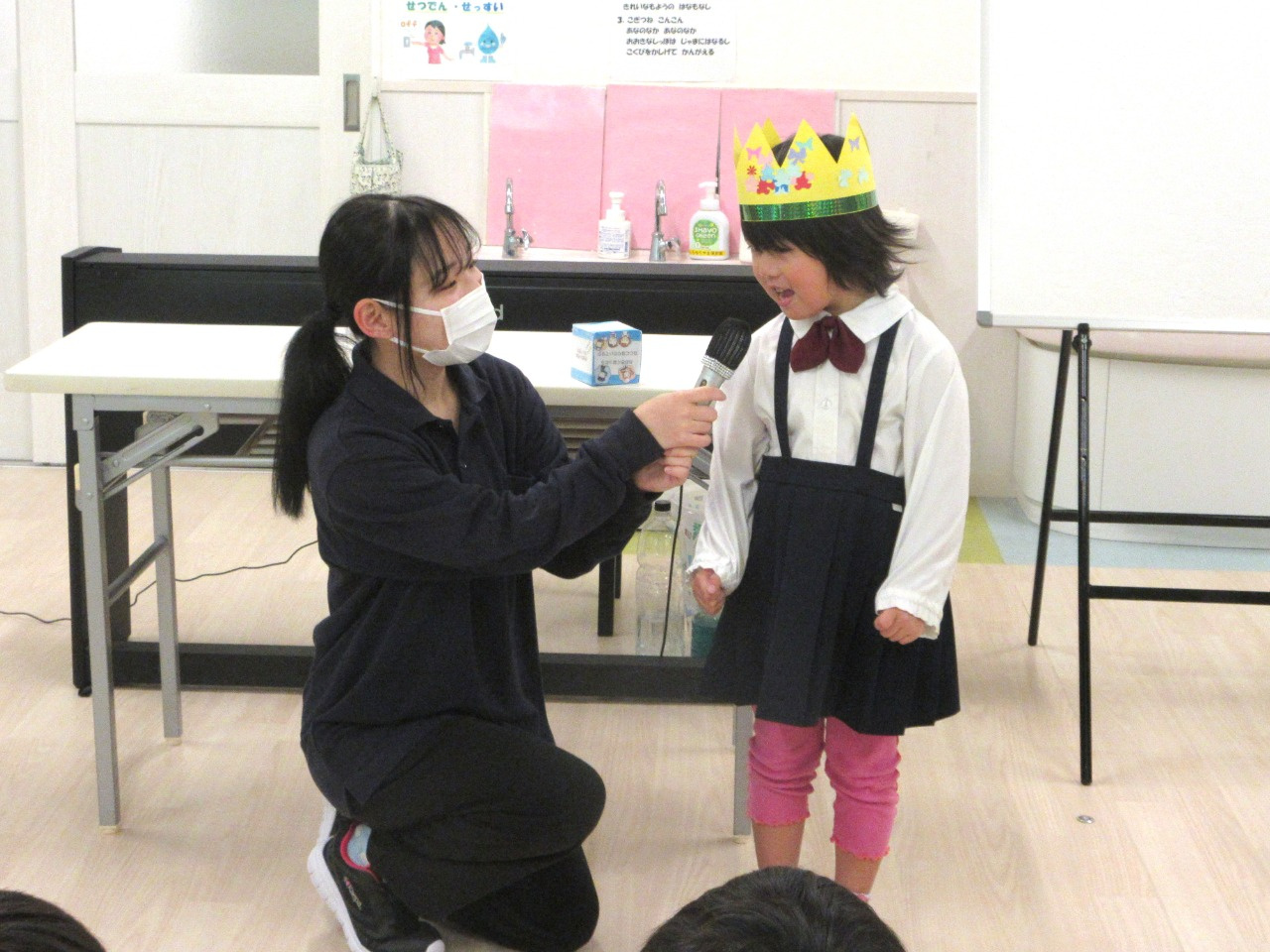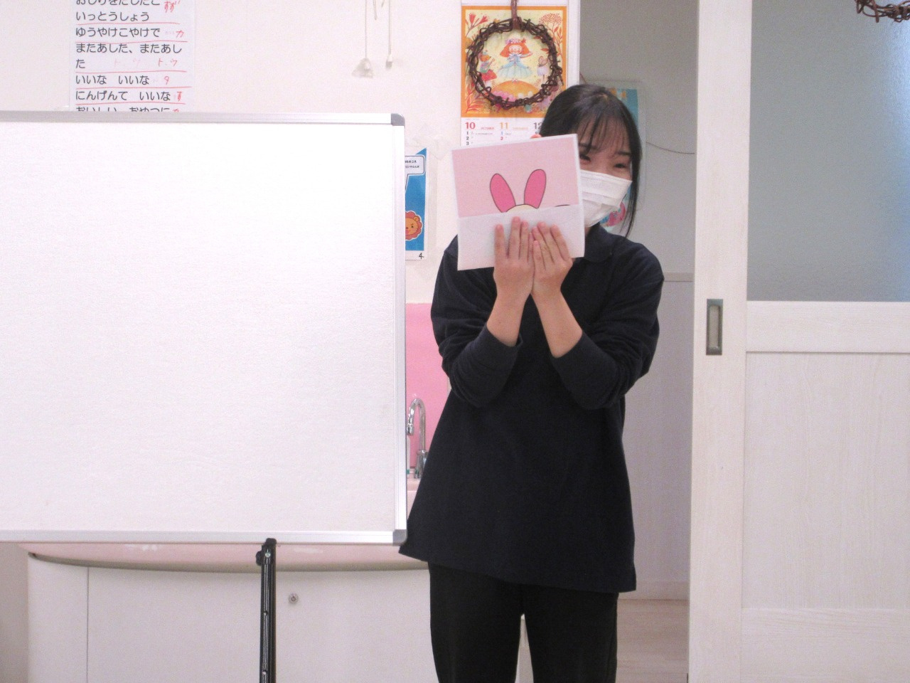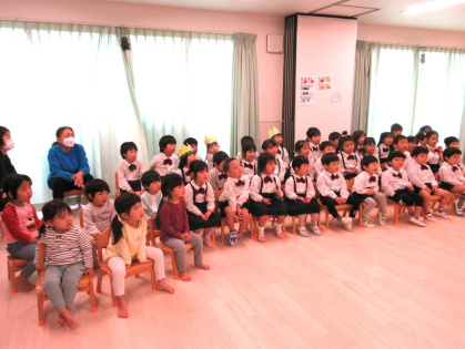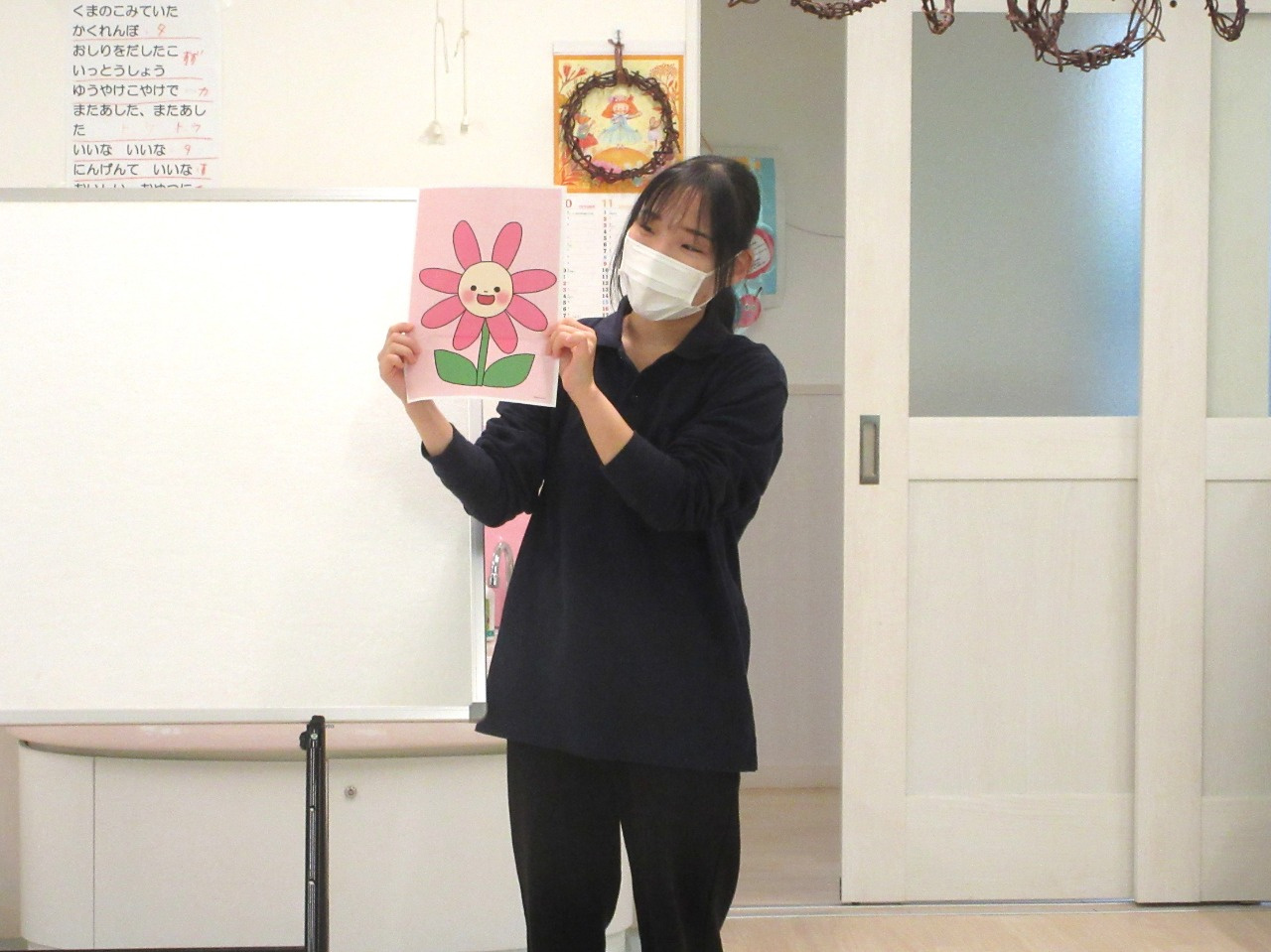 もう一つは「ちょっぴりいじわるクイズ」を見ました。「これなーんだ?」「うさぎー!」と、答える子ども達。カードをめくると・・・お花に!!色々なものに変身すると「えー!」と驚く子もおり、とても盛り上がっていました。