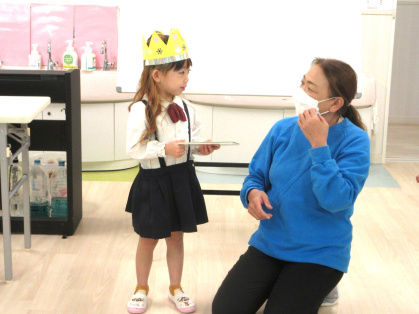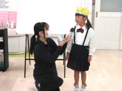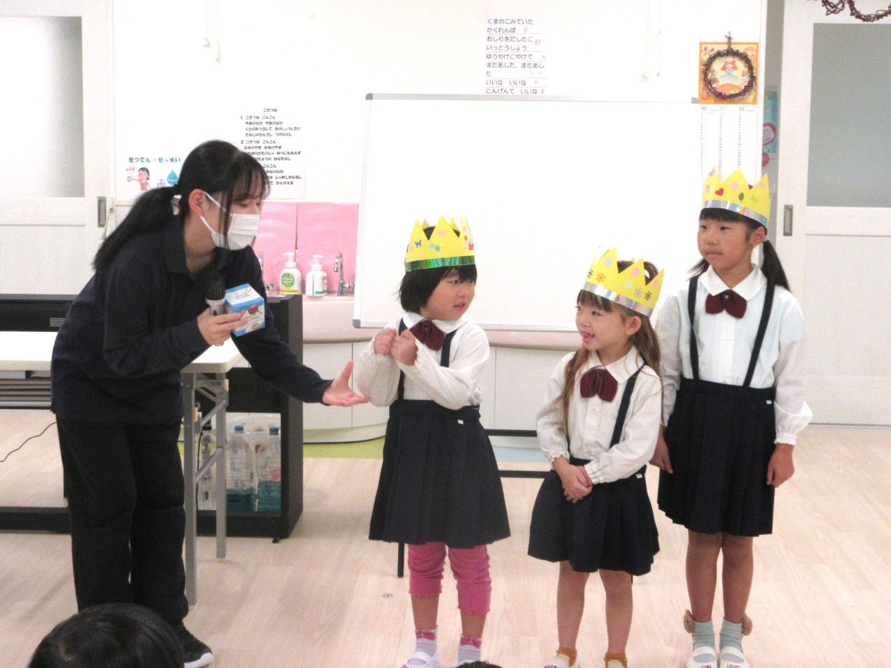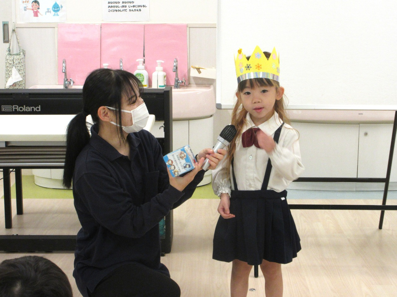 11月18日(火)、11月生まれのお友達の誕生会を行いました。幼児クラスは、きりん組1名、ぞう組2名のお友達が一つずつ大きくなりました。今回のインタビューでは、サイコロを転がして出た目の質問に答えました。「なにがでるかな~♪?」と、ドキドキのみんな。名前、年齢、好きな遊び、好きな色、大きくなったら何になりたいかを立派に答えてくれました。