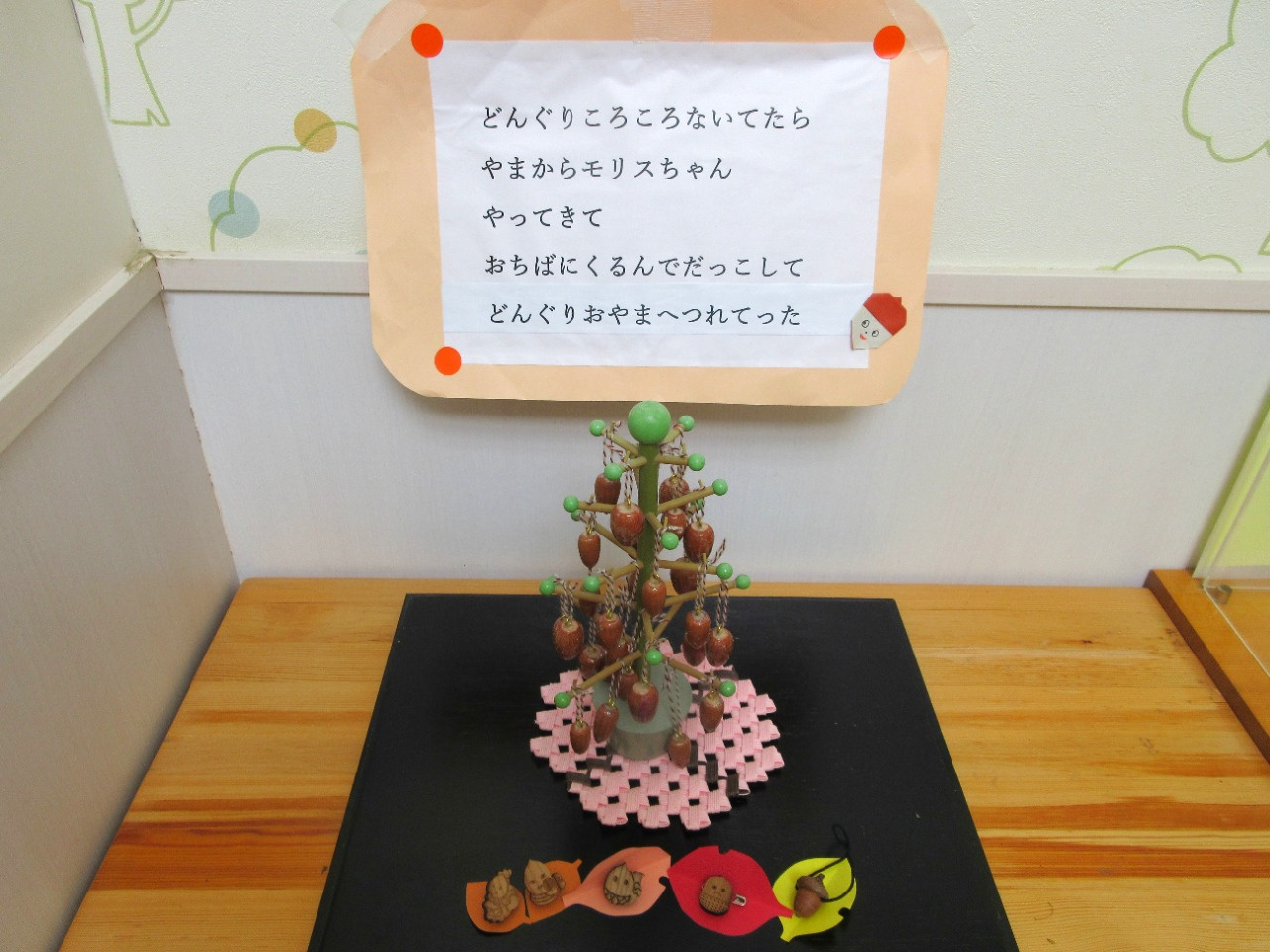 その後は、園長Tからのお楽しみを見ました。子ども達の大好きなクロちゃんが運んできてくれた箱の中には、ドングリ山などが入っており「今から何が始まるのかな~?」とワクワク。「どんぐりころころ」のペープサートでは、どんぐりやまのドンちゃんと、なんとリスのモリスちゃんも登場!園長Tから3番があることを教えてもらい、みんなで1番~3番まで歌って楽しい時間を過ごしました。