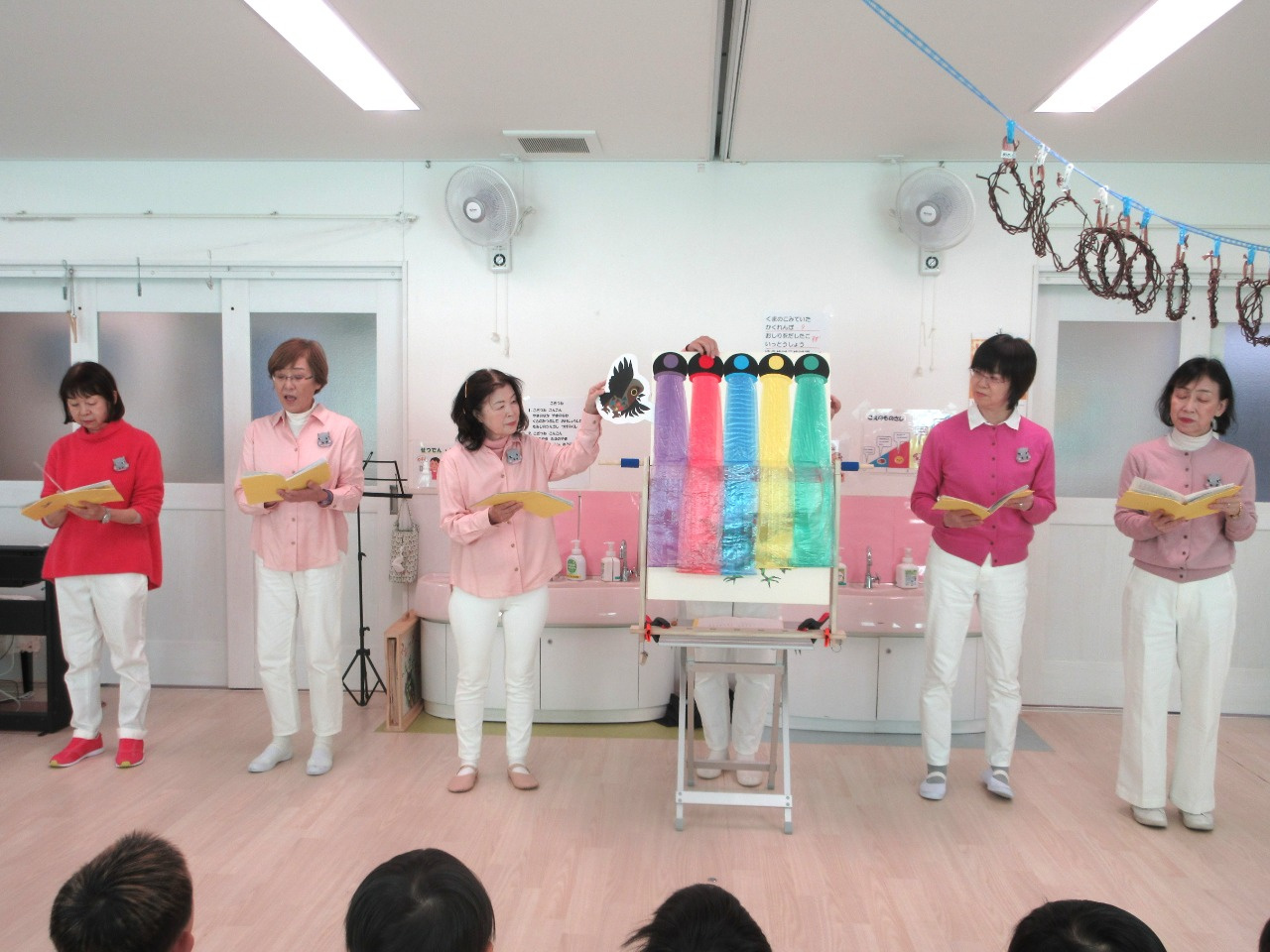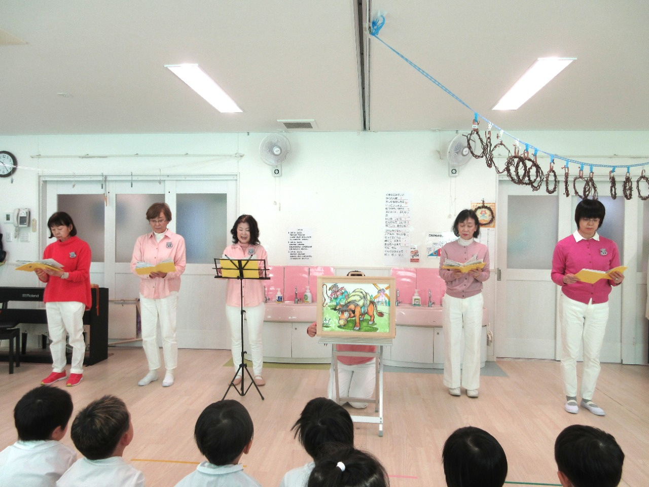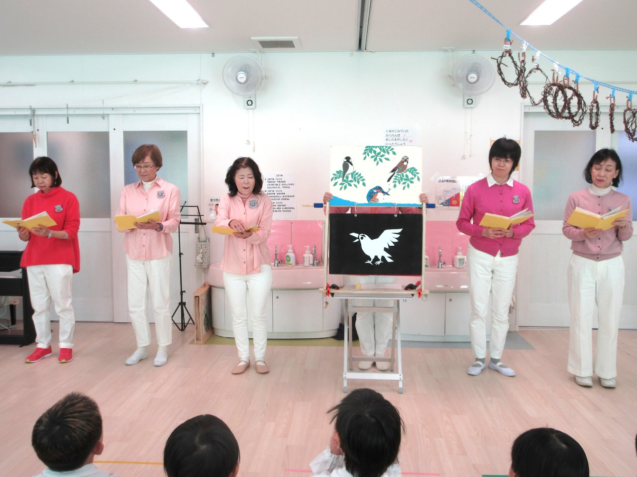11月20日(木)、幼児クラス(3歳児ぱんだ組・4歳児きりん組・5歳児ぞう組)は、お楽しみ会に参加しました。今年度も、おはなし★かばさんの皆さんがしんもりやま保育園に来てくださり、子ども達に言葉の楽しさを伝えてくださいました。今年度のプログラムは「かばさんサンバ」「ふくろうのそめものや」「ことばあそびうた」「もこ もこもこ」「ブレーメンのおんがくたい」でした。「かばさんサンバ」のリズムに合わせて、おはなし★かばさんの皆さんが登場すると「どんなおはなしがあるのかな~」と、手拍子をしながらワクワクしている子ども達。抑揚のある話し方や迫力のある動き、子ども達が知っているお話もあり、興味津々で聞いていました。