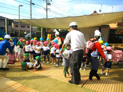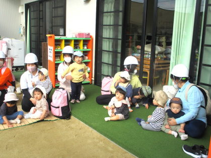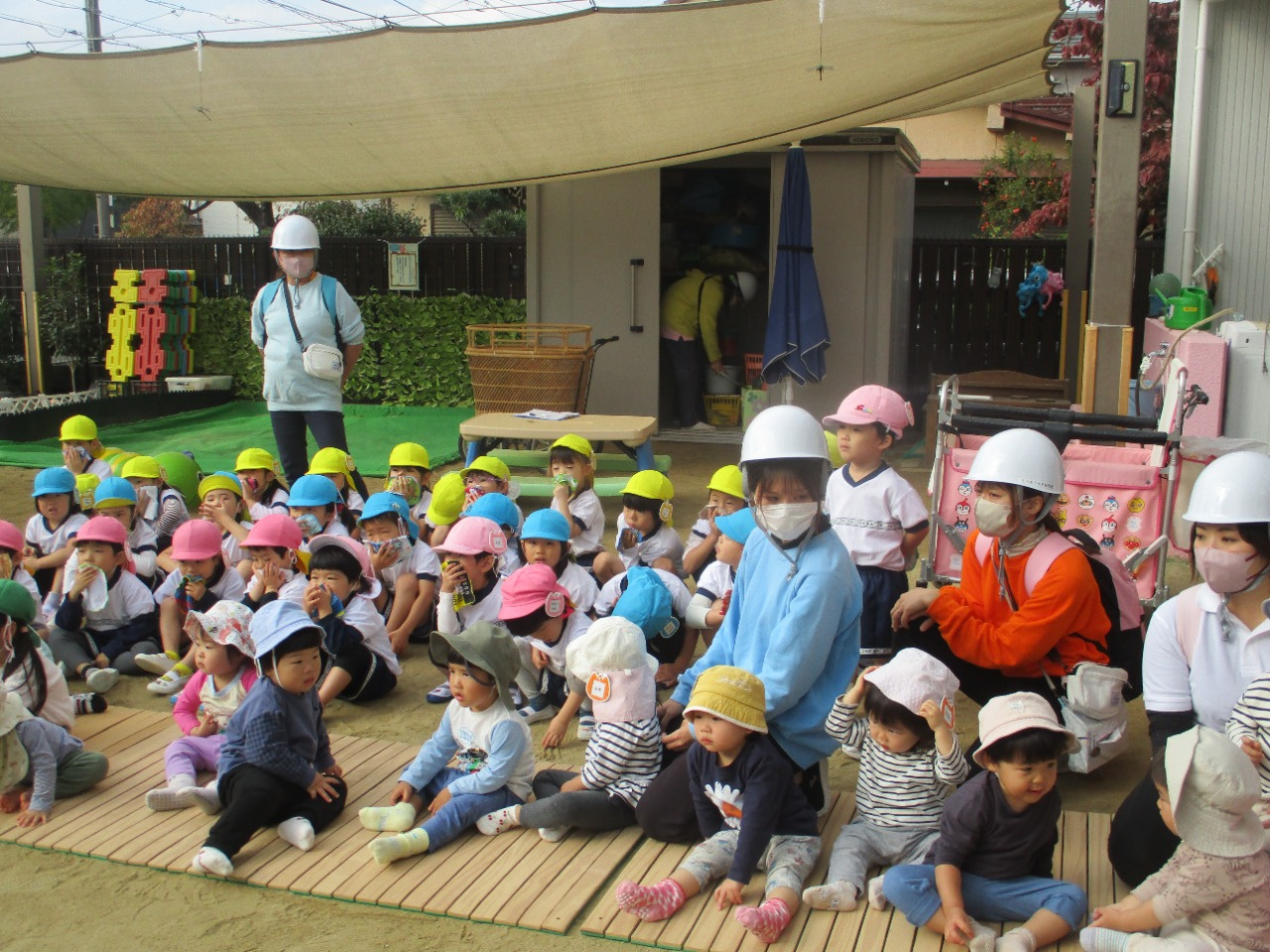 11月21日(金)、全園児で消防訓練を行いました。訓練の内容は、給食室から出火したという設定で避難の仕方を練習しました。放送が流れると、幼児クラス(3歳児ぱんだ組・4歳児きりん組・5歳児ぞう組)は、ハンカチで口を覆い、上靴のままテラスから園庭へ避難しました。乳児クラス(0歳児ひよこ組・1歳児りす組・2歳児うさぎ組)は、階段の手摺りをしっかりと持って園庭に避難しました。皆、真剣に避難することができました。