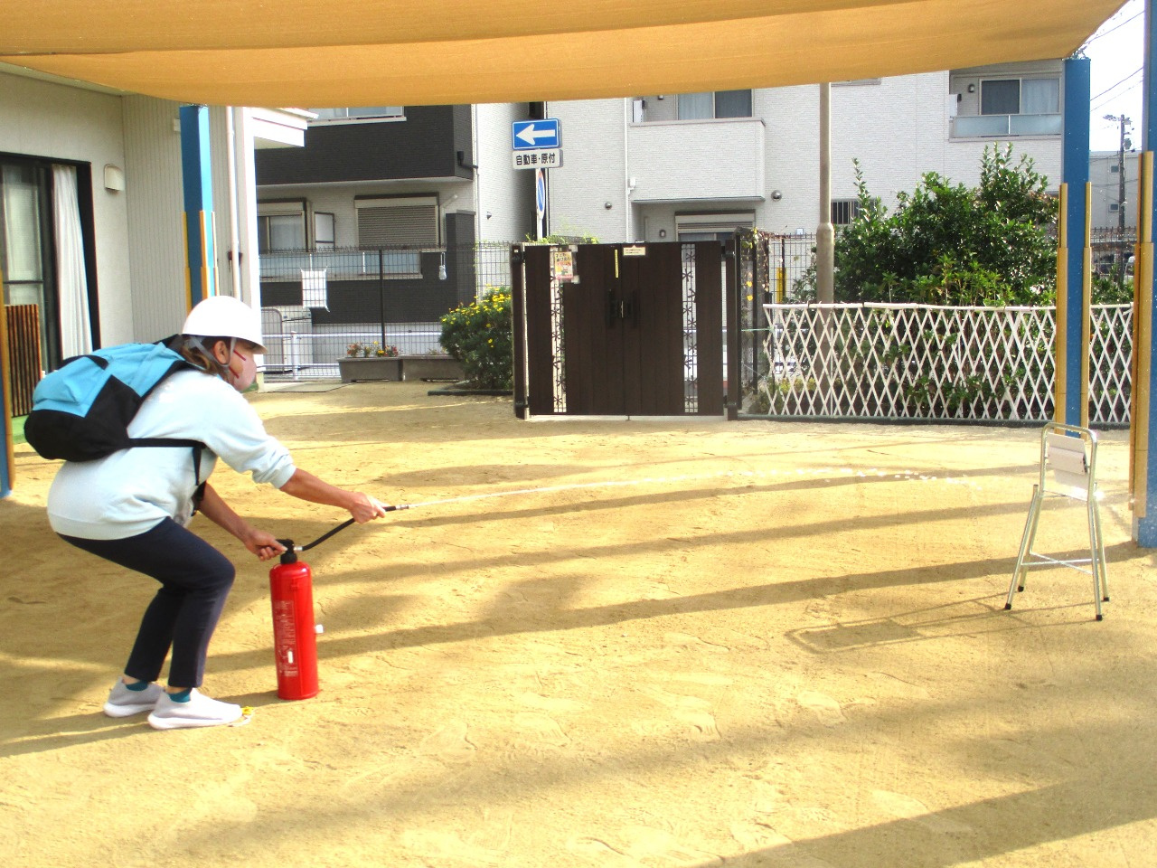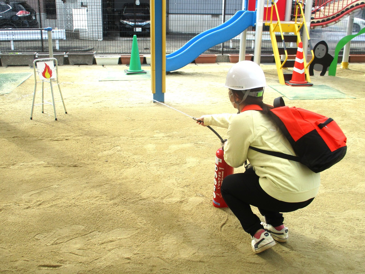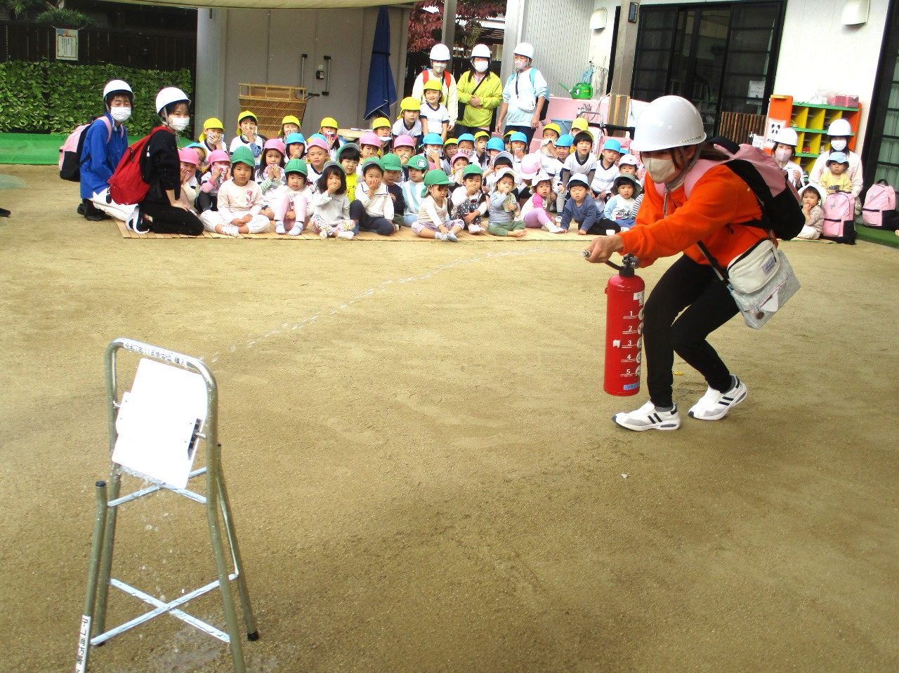 避難後は、担当の先生から「お・か・し・も」についての話を聞き、皆で確認をしました。その後は、守山消防署からお借りした水消火器と的を使い、実際に先生達が消火するところを見ました。「がんばれー!」と、声援を送る子ども達でした。