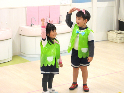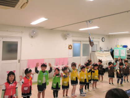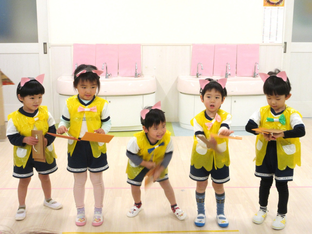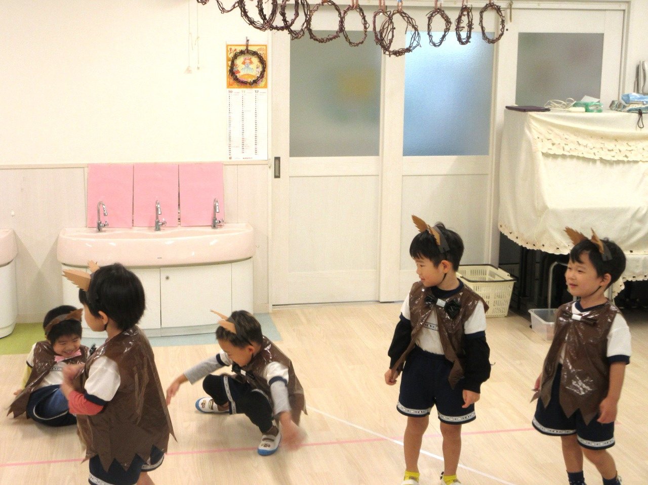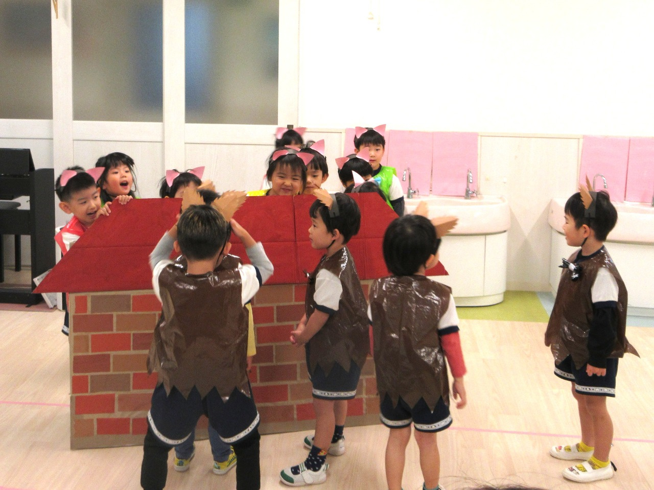 12月3日(水)、3歳児ぱんだ組の保育参観を行いました。ぱんだ組の子ども達にとっては、初めての発表だったので、朝からドキドキ。劇のお話は、オペレッタ「3匹のこぶた」をかわいらしく演じてくれました。