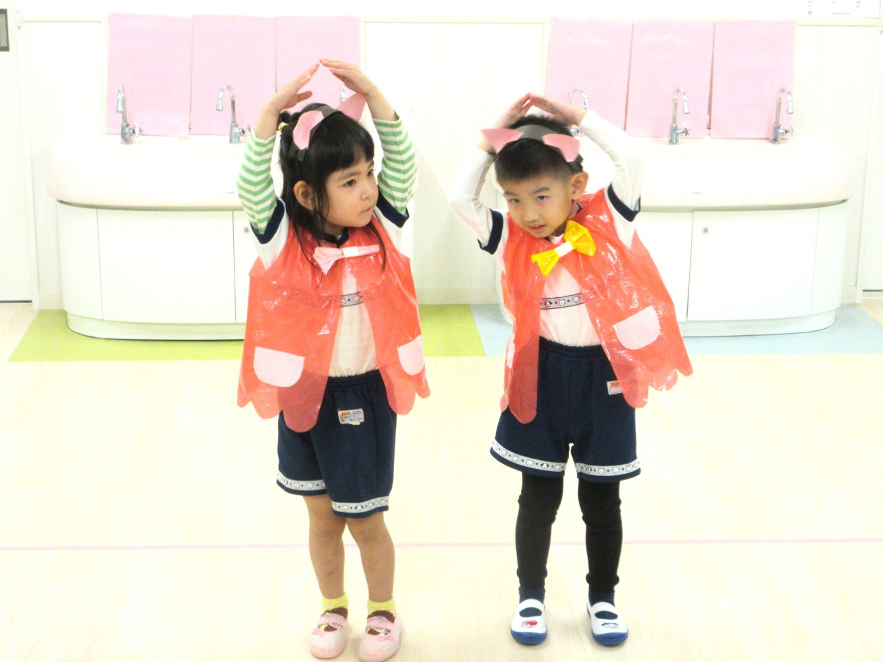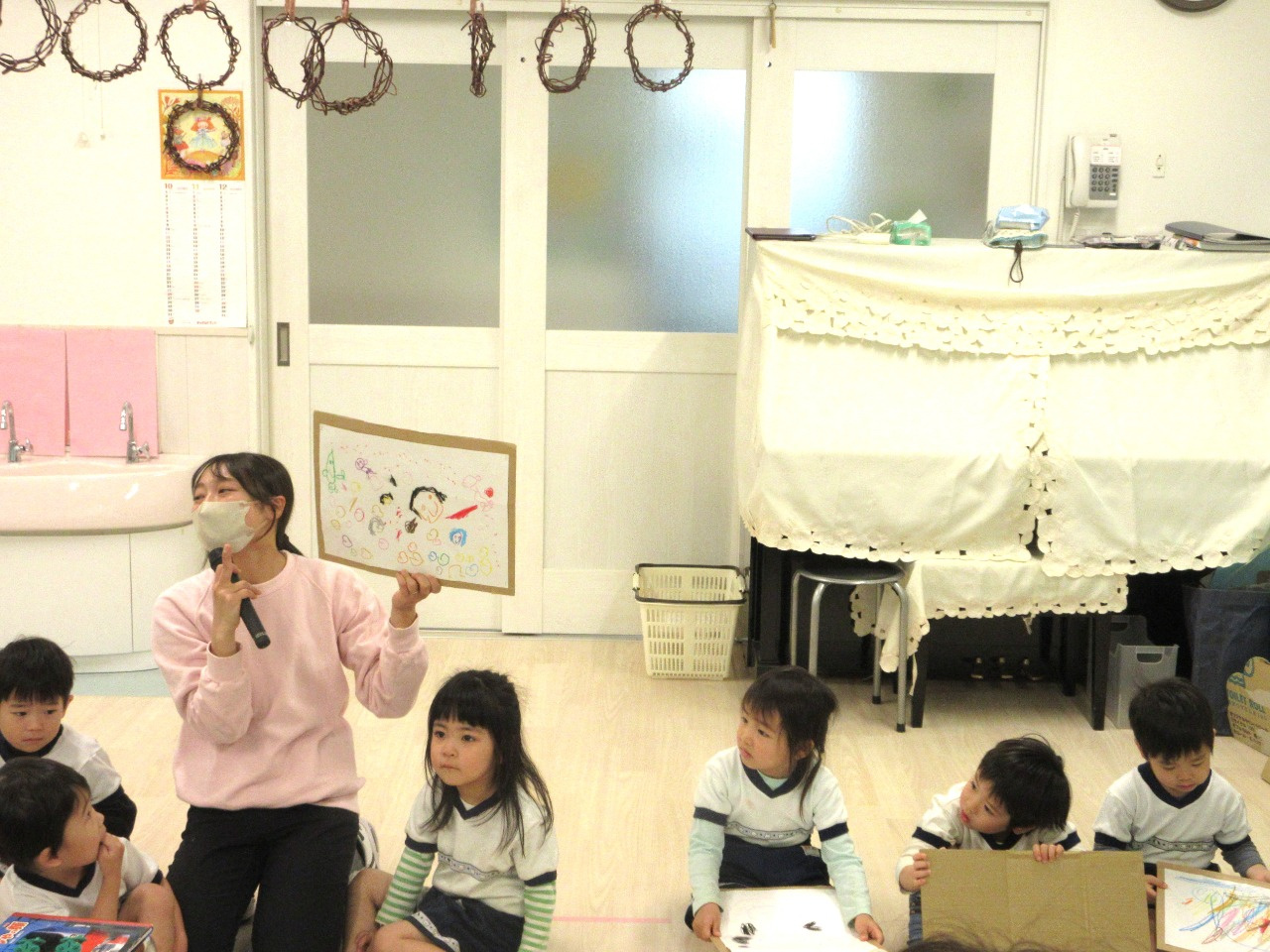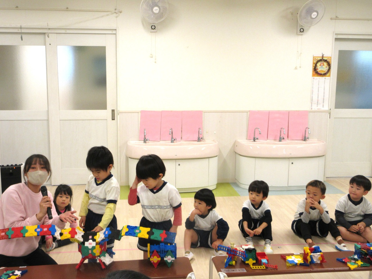 劇の後は、カスタネット合奏「おつかいありさん」、歌「こぎつね」、ブロックで作った作品とお絵描きの紹介をしました。
