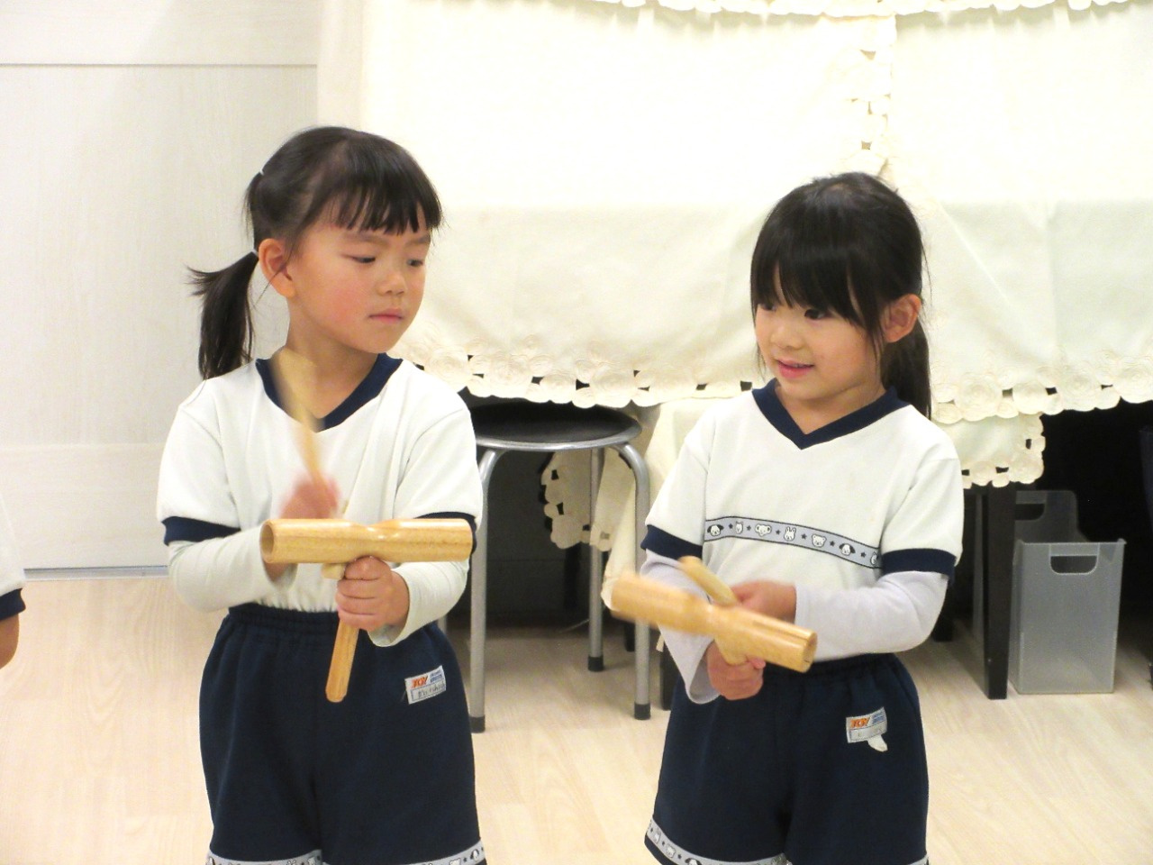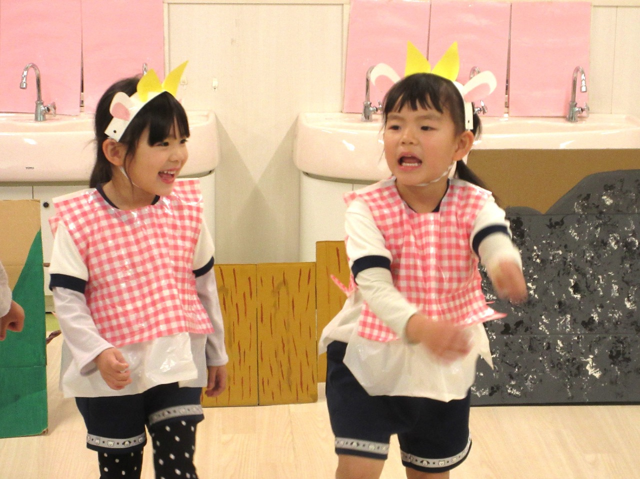 12月3日(水)、4歳児きりん組の保育参観を行いました。今年度も3歳児ぱんだ組と同日に行ったので、自分達の出番がくるまでは、隣の部屋でドキドキしながら待機していました。劇のお話は、オペレッタ「3匹のヤギとトロル」を演じてくれました。