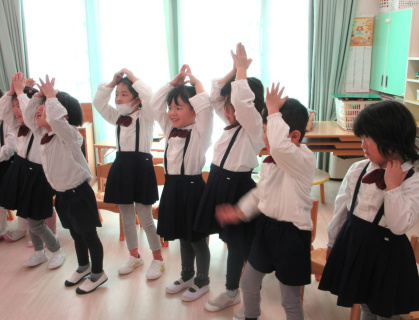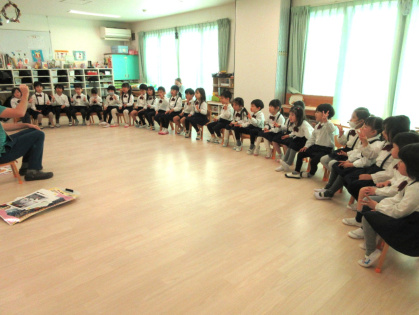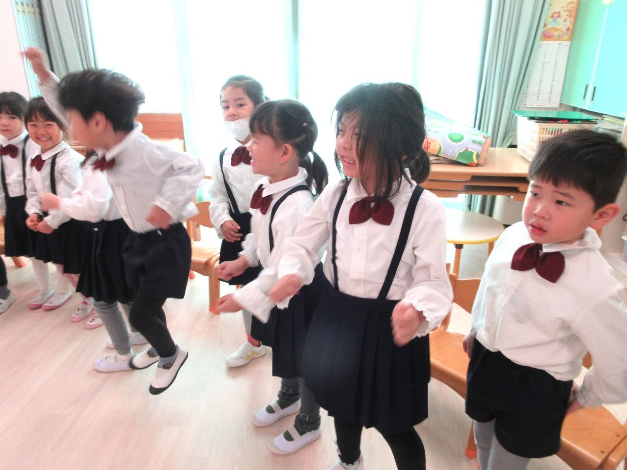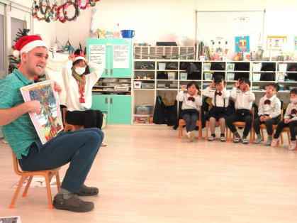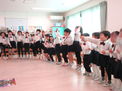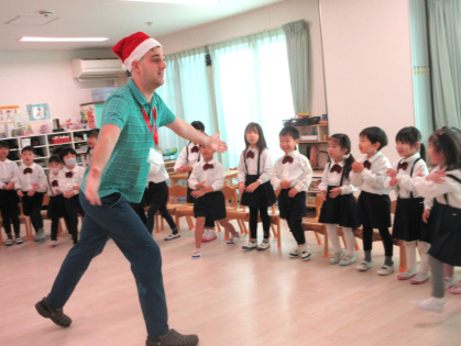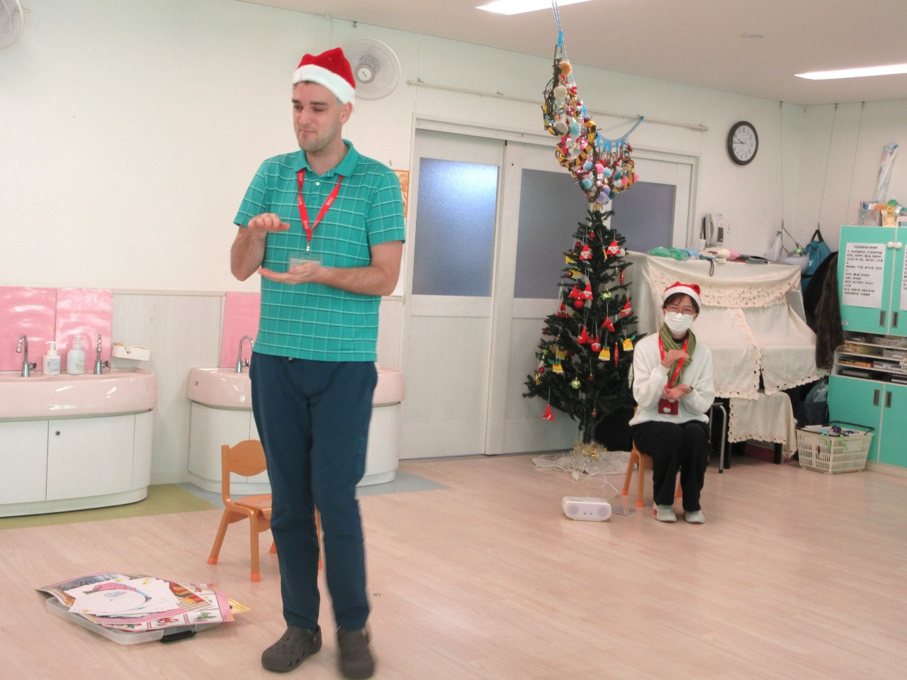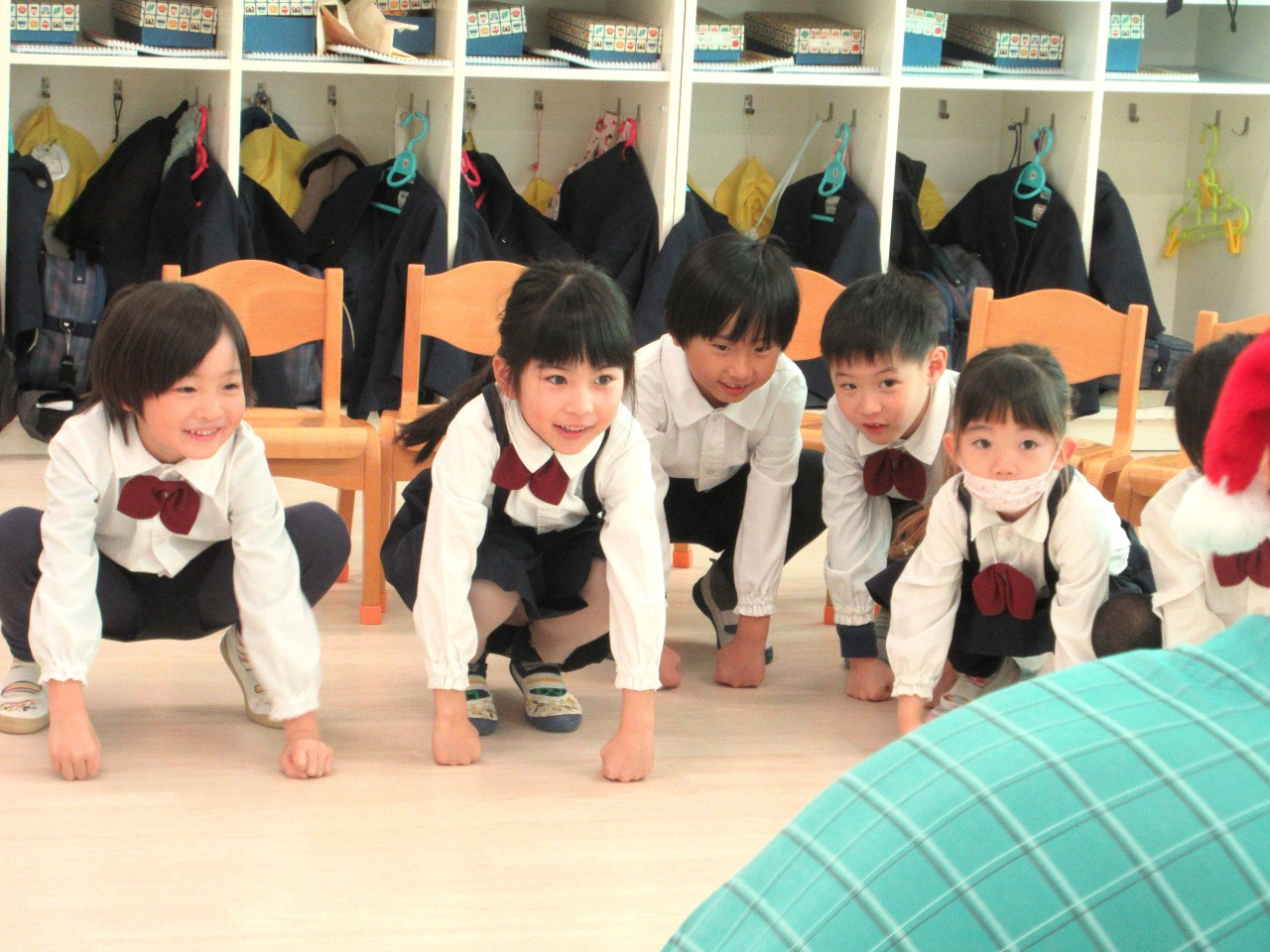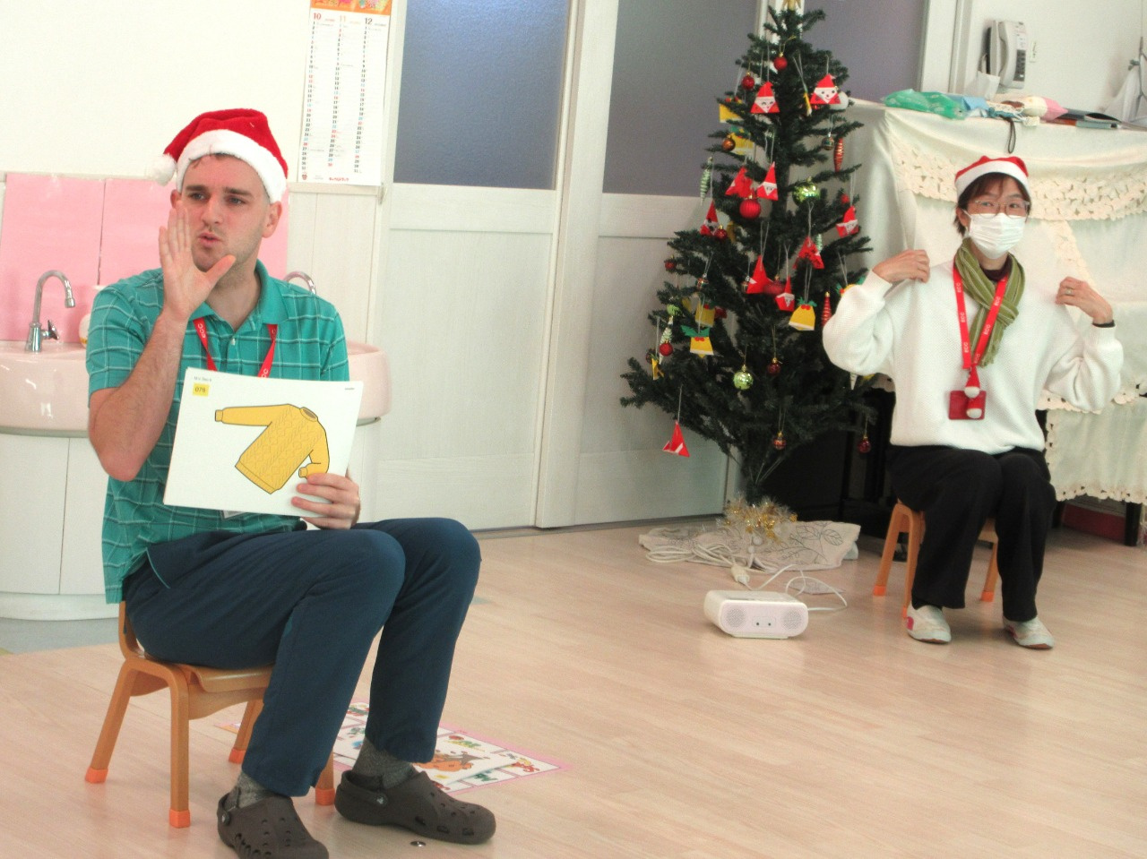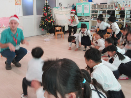 2025年12月19日(金) イベント報告 < お知らせ NEW 英語教室(4・5歳児クラス) 12月18日(木)、4・5歳児クラスは英語教室がありました。今回は、クリスマスということでいつも来てくださる先生とアメリカ人のネイティブティ―チャーが来てくださいました。先生からはクリスマスに因んだ絵本やダンス、手袋、トナカイ、雪だるま、靴下、プレゼント、サンタクロースの英語を教えていただきました。また、ツリーやカニ、サルの英語をジェスチャーをまじえて教えていただき、子ども達はとても楽しい時間を過ごしました。