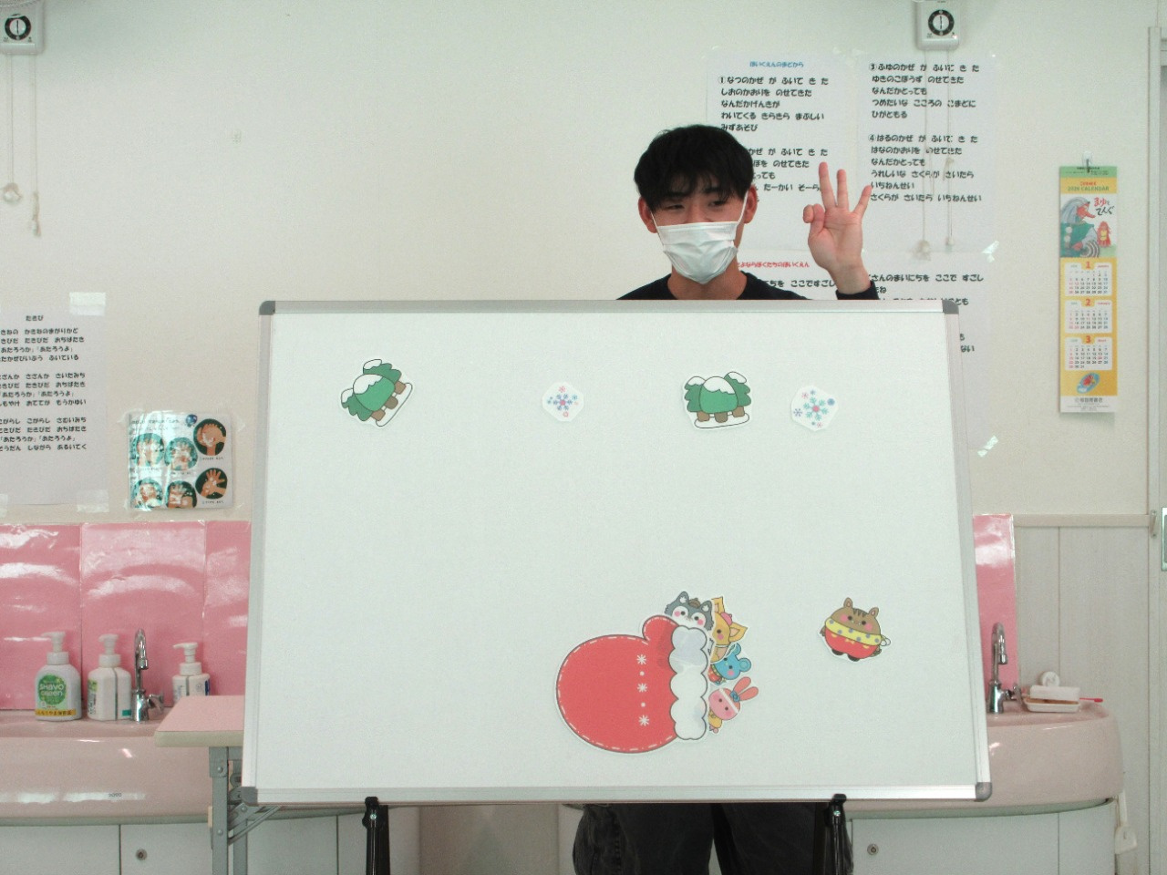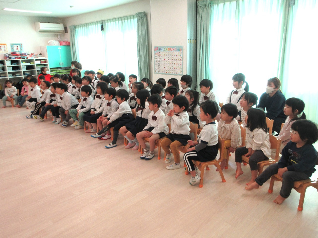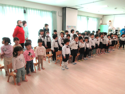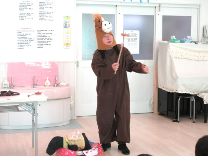 先生の出し物は、パネルシアター「てぶくろ」を見ました。おじいさんが雪の森の中に手袋を落としてしまいました。そこへ「わたしもいれて」と、はやあしうさぎやおしゃれぎつねなどの動物がどんどん増えていき、手袋はぎゅうぎゅうに。次は、どんな動物が来るのか予想しながら見ている子ども達でした。その後は、皆で今月の歌「たきび」を歌いました。