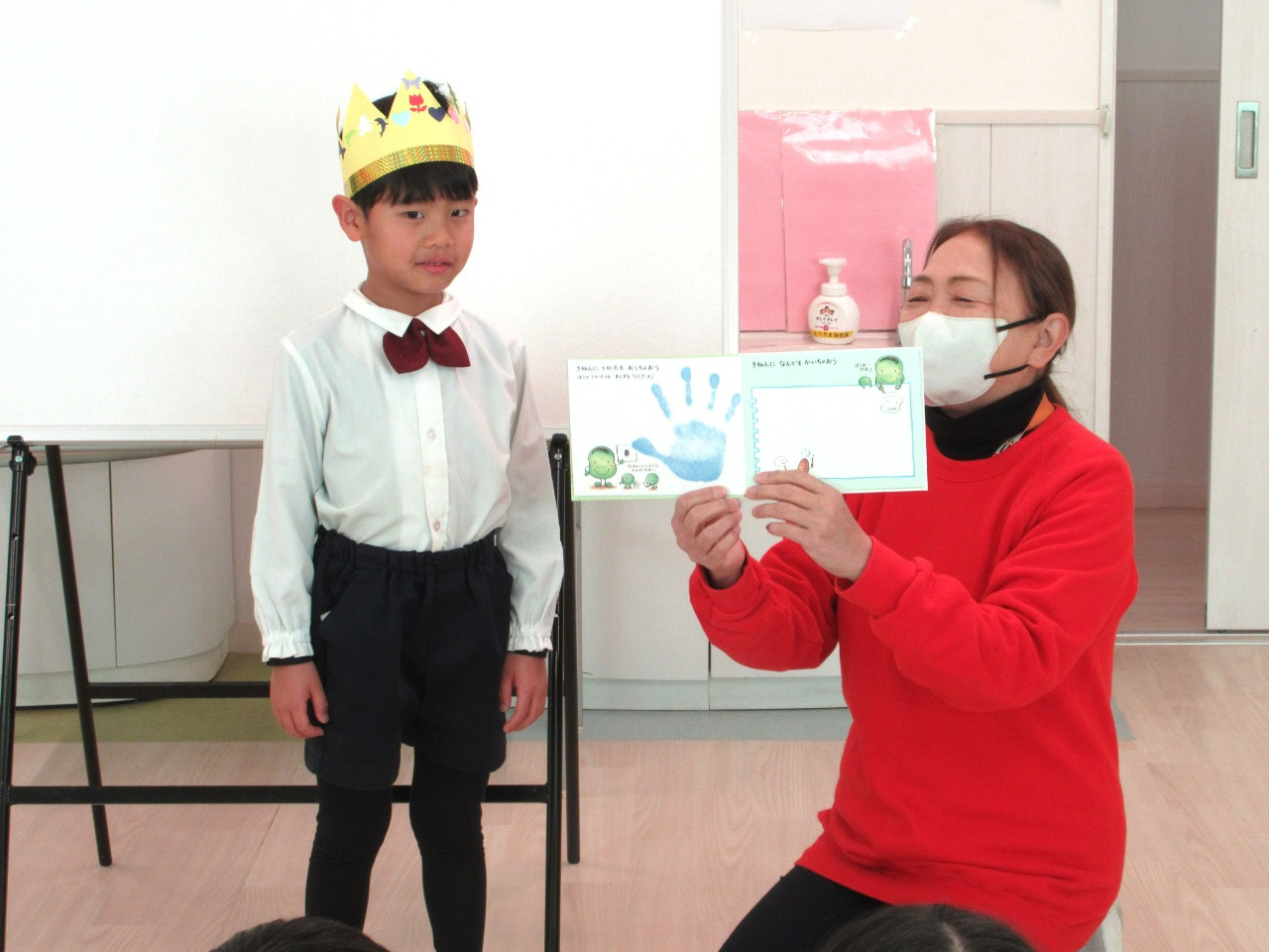 1月22日(木)、1月の誕生会を行いました。幼児クラスは、ぞう組1名のお友達が一つ大きくなりました。インタビューに答えたり、皆に「たんじょう日のうた」でお祝いをしてもらいました。その後は、担任の先生から絵本のプレゼントをもらいました。誕生児さんの手形を見て「おおきい~!」と、皆も嬉しそうにお祝いをする姿が見られました。