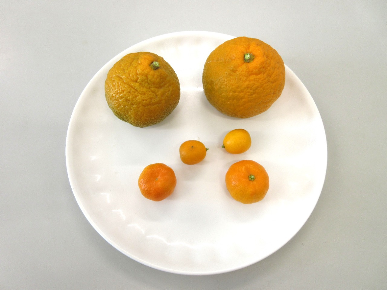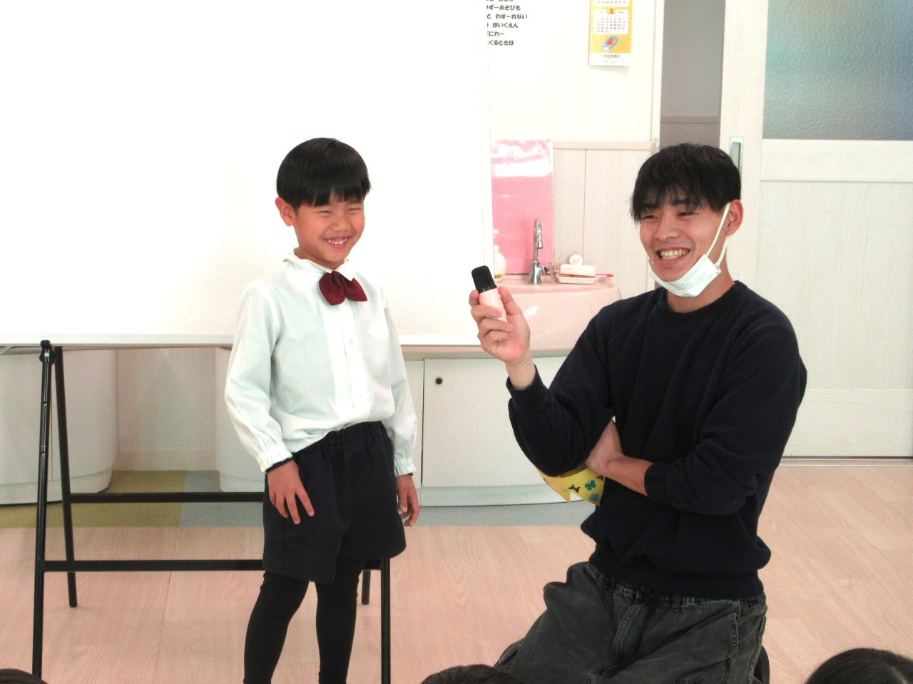 最後は、園長先生とクロちゃんが登場!園長先生から園庭で収穫したミカンとコマの紹介をしていただきました。「ミカンにもいろんな名前があるんだよ」と「温州みかん」や「橘小みかん」、「金柑」を見せていただきました。また、園長先生のコマ回しに子ども達も大喜び。「すごーい!」と、大拍手をするなど興味津々で見ていました。