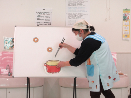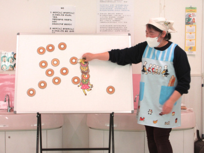 先生からの出し物は、パネルシアター「ドーナツくださいな」を見ました。先生がエプロンを着けると「どうして~?」と、不思議そうにする子や何が始まるのかワクワクしている子の姿も。一緒に材料を入れる真似をしてドーナツを作ったり、キリンやサルなどの動物達が首やしっぽにドーナツをのせて持って帰る姿に大笑い!とても楽しそうに見ていました。