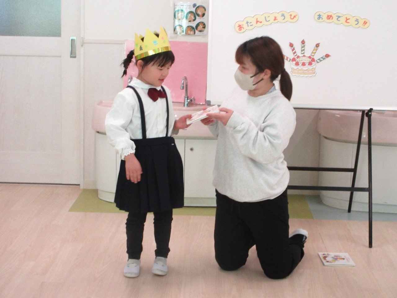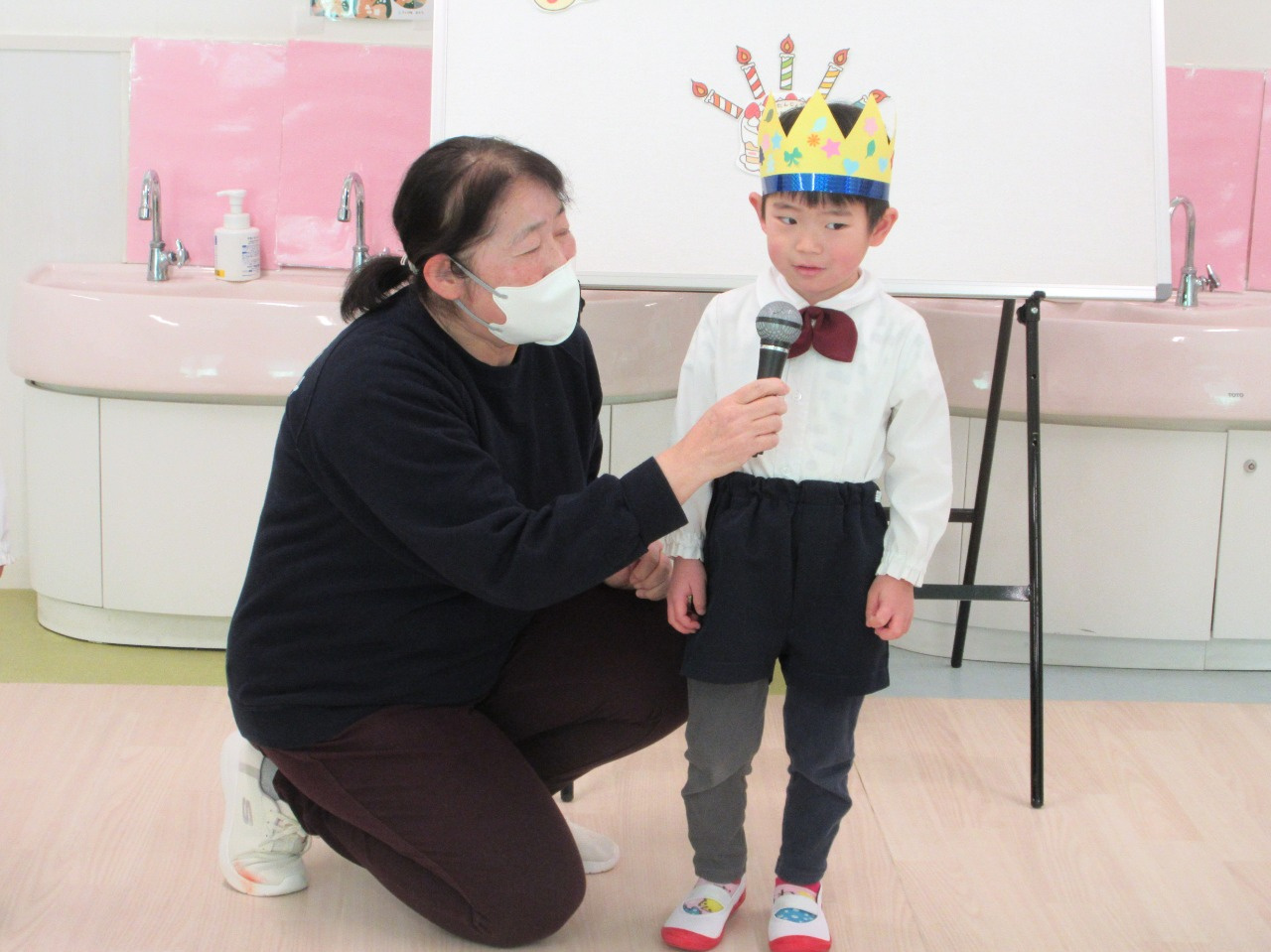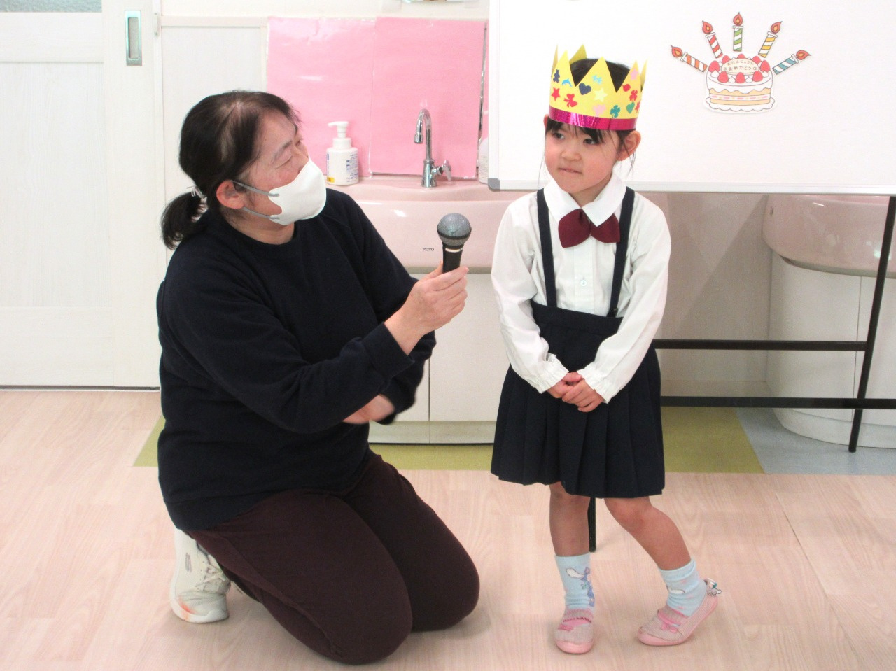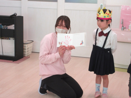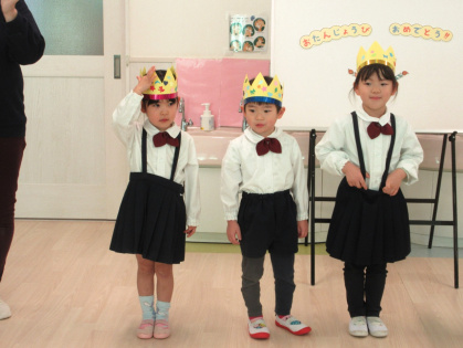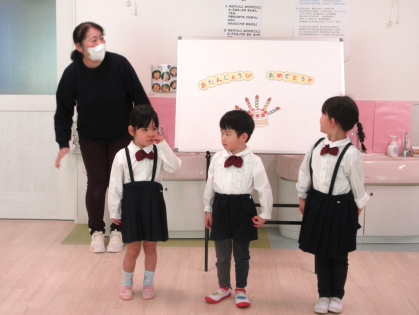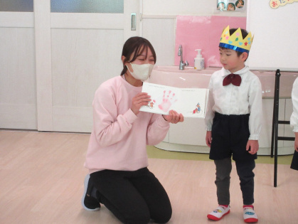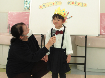 2月12日(木)、2月の誕生会を行いました。今月は3歳児ぱんだ組3名、4歳児きりん組2名(内3歳児ぱんだ組1名のお友達は欠席でした)のお友達が一つずつ大きくなりました。インタビューでは、名前や年齢、好きな食べ物などを答えてくれました。その後は、みんなに「誕生日のうた」でお祝いをしてもらい、担任の先生から絵本のプレゼントをもらいました。