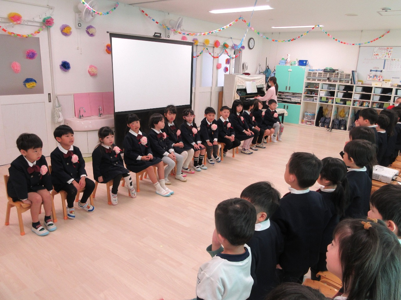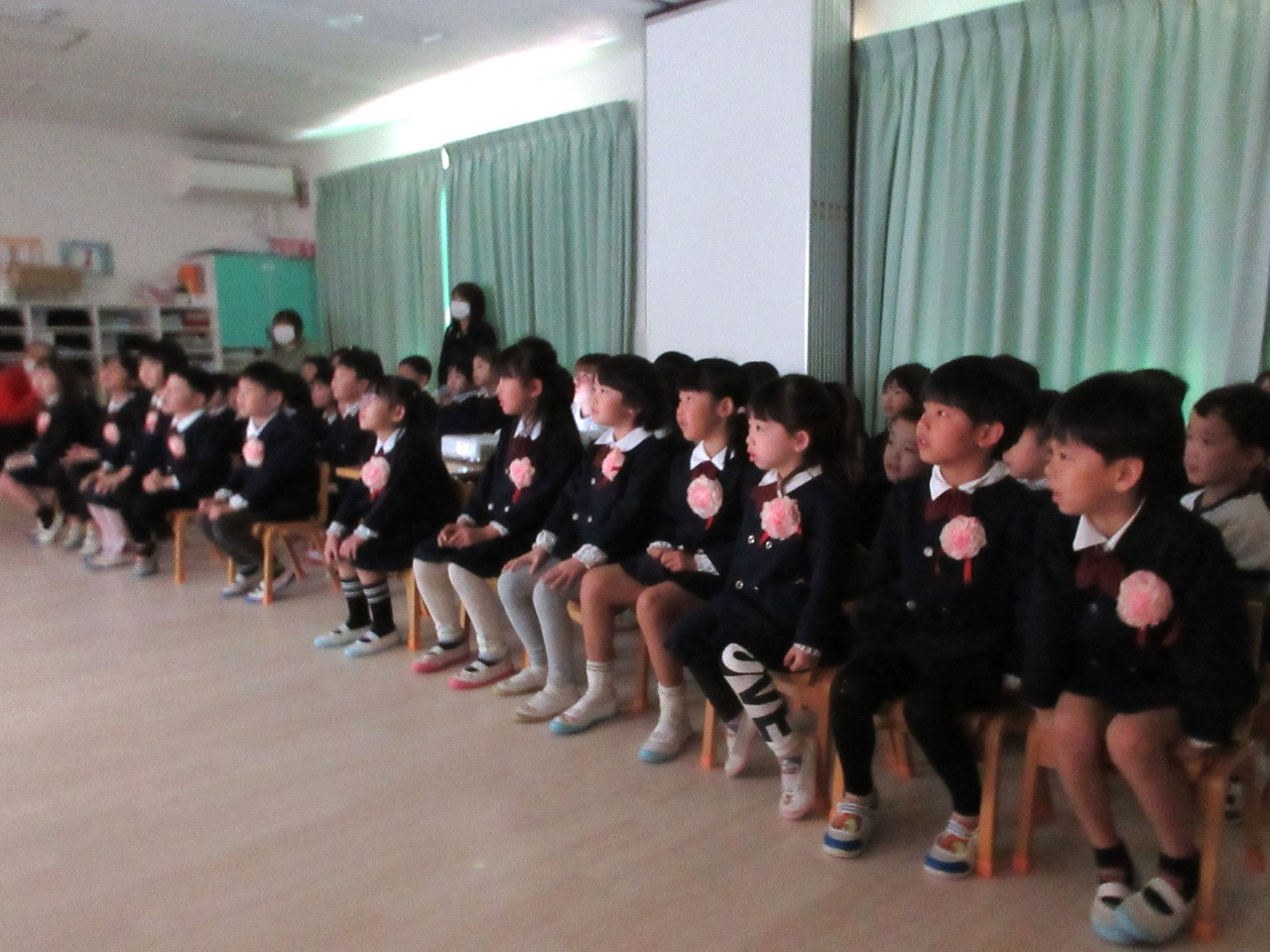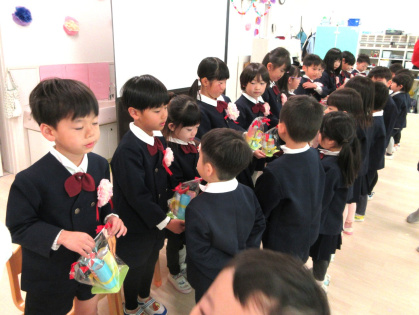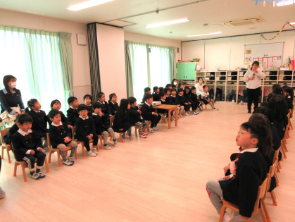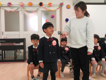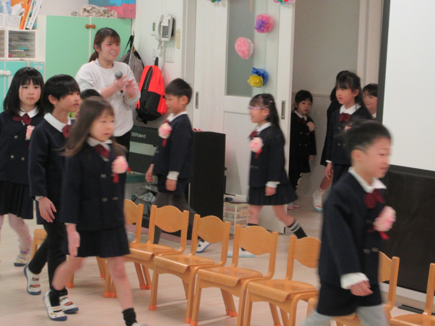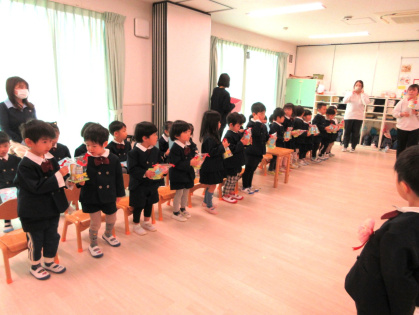 3月10日(火)、幼児クラス(3歳児ぱんだ組・4歳児きりん組・5歳児ぞう組)でぞう組さんとのお別れ会をしました。『ドキドキドン一年生』のピアノに合わせて、ぞう組さんが入場。ぱんだ組さんときりん組さんと対面で着席するとみんなとっても嬉しそう。これから始まる会にワクワクドキドキ!