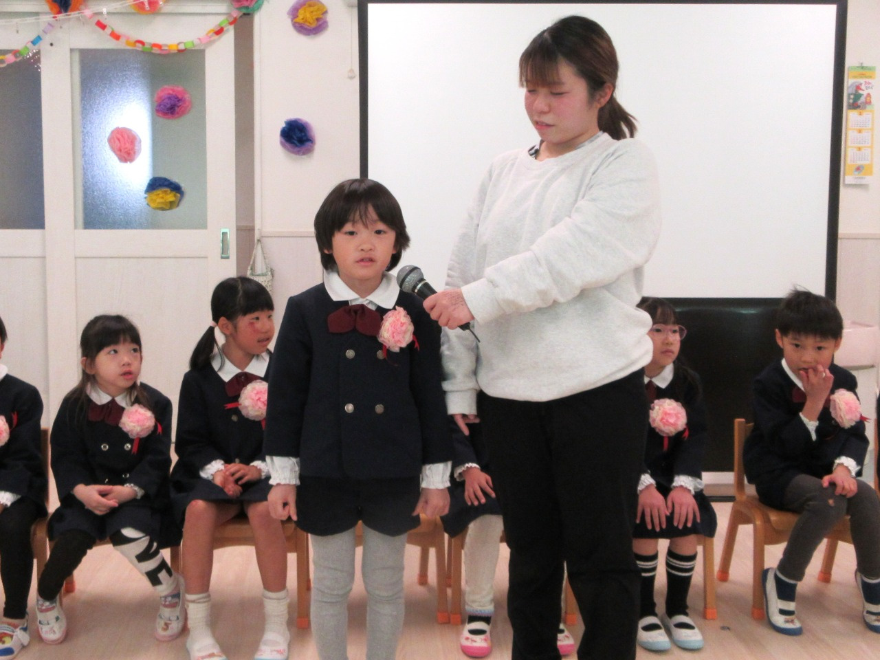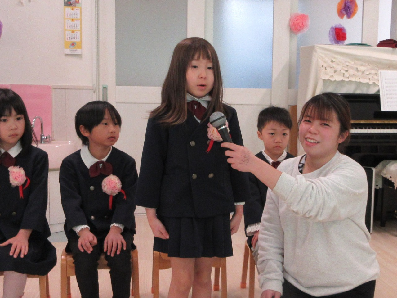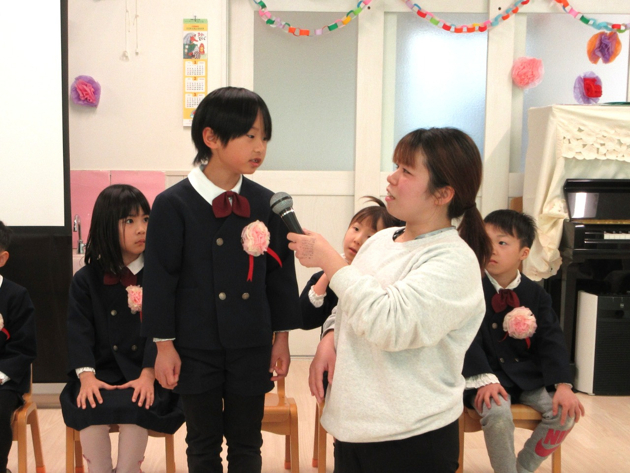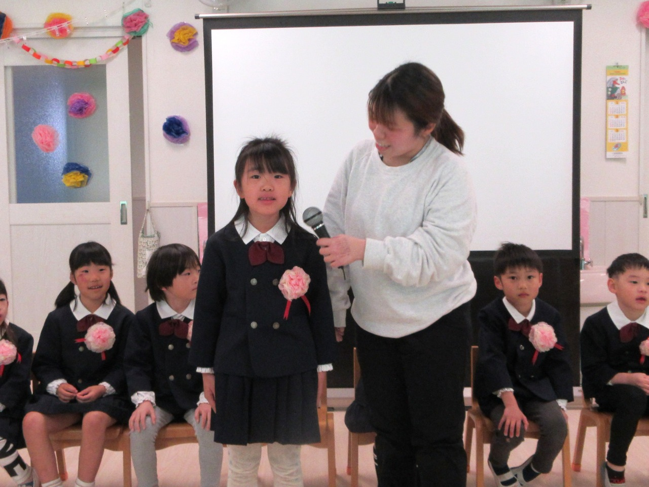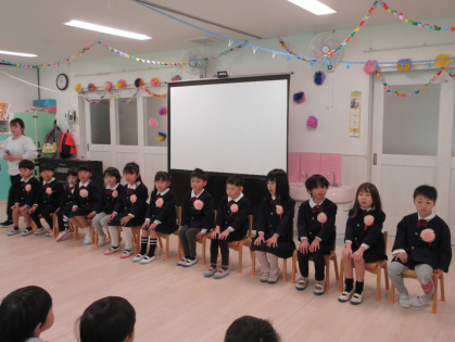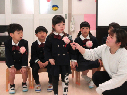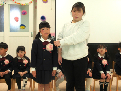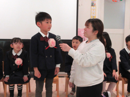 司会の先生に一人ずつインタビューをされると、緊張しながらも『どこの小学校へいきますか?』『小学校で楽しみなことは?』『小学校で頑張りたいことは?』の質問にしっかりと答えていました。