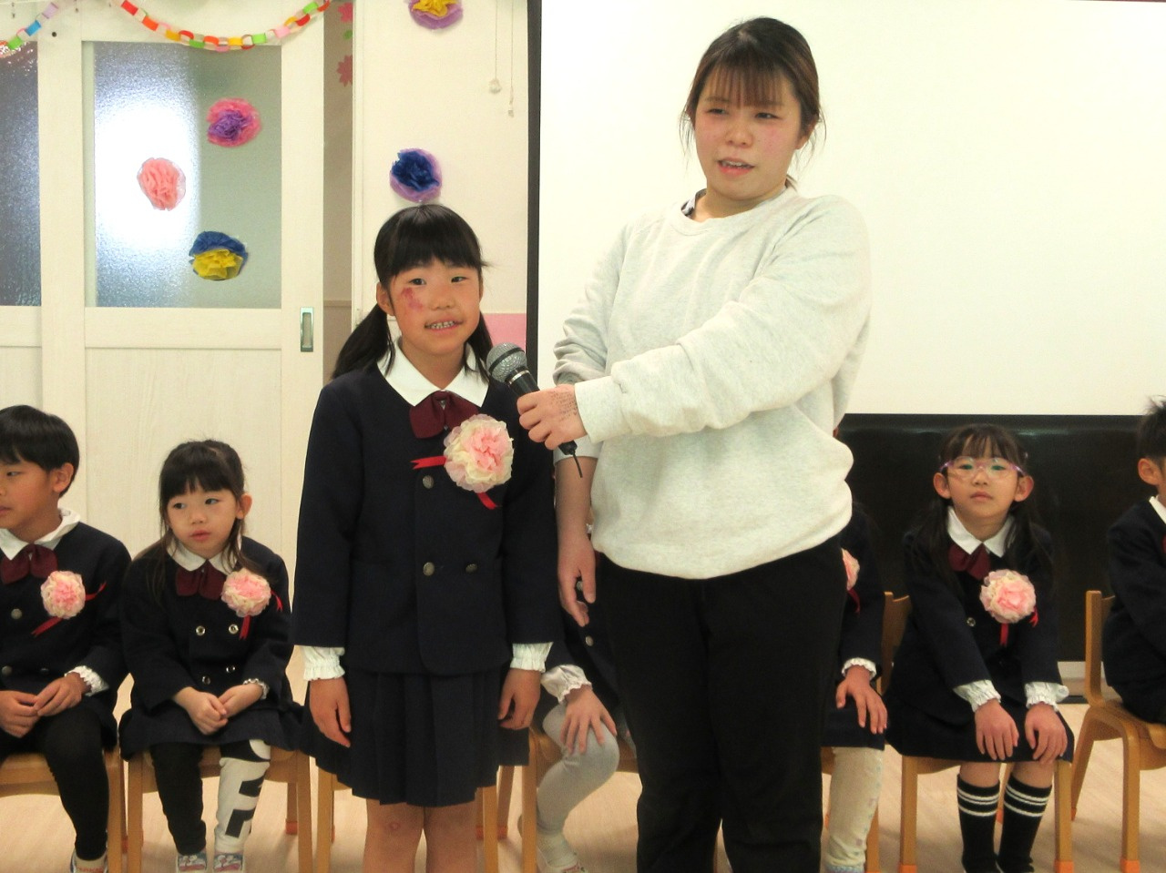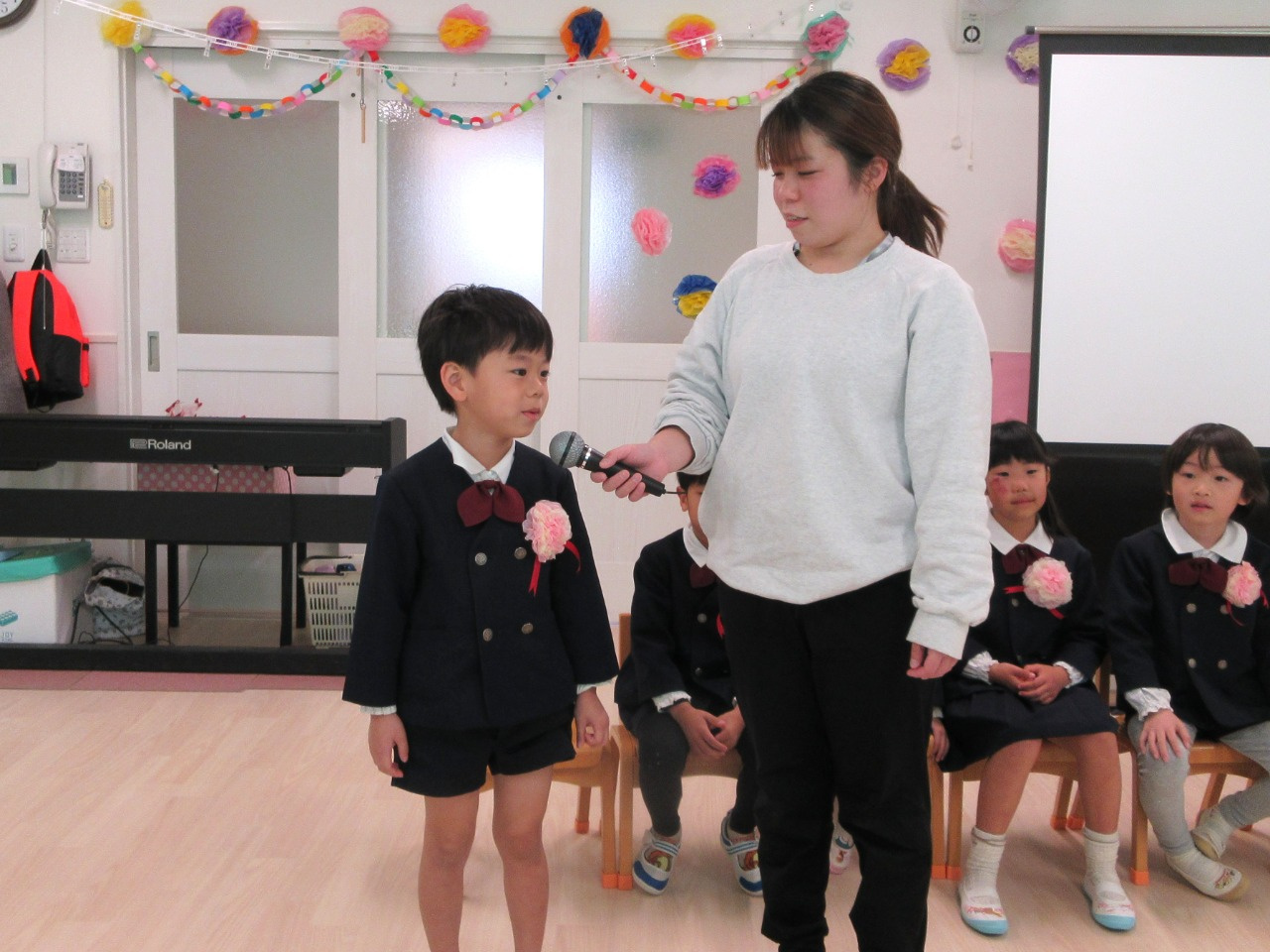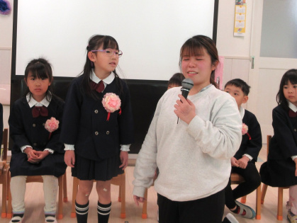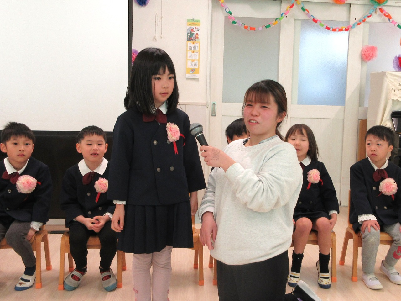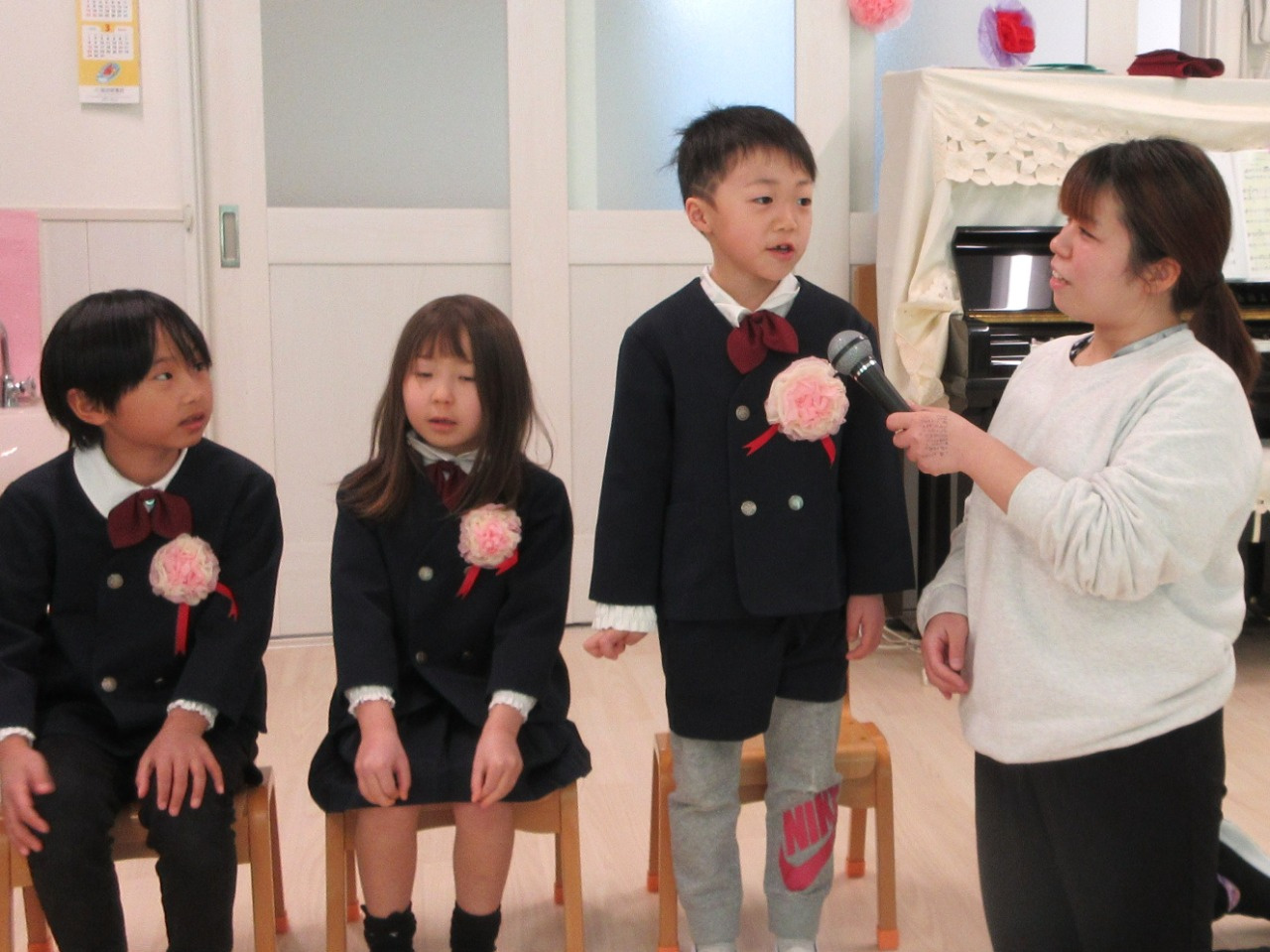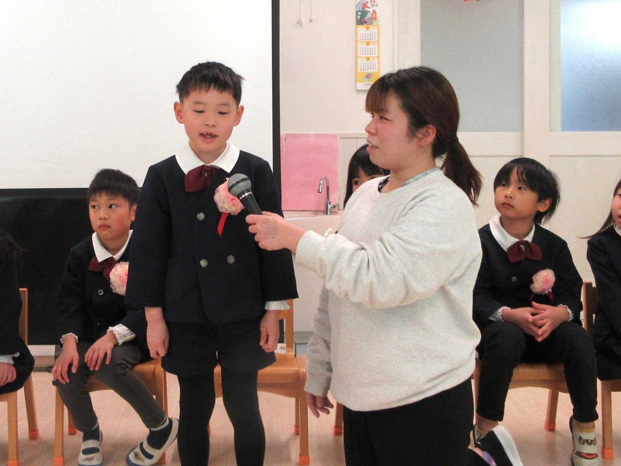 司会の先生に一人ずつインタビューをされると、緊張しながらも『どこの小学校へいきますか?』『小学校で楽しみなことは?』『小学校で頑張りたいことは?』の質問にしっかりと答えていました。
