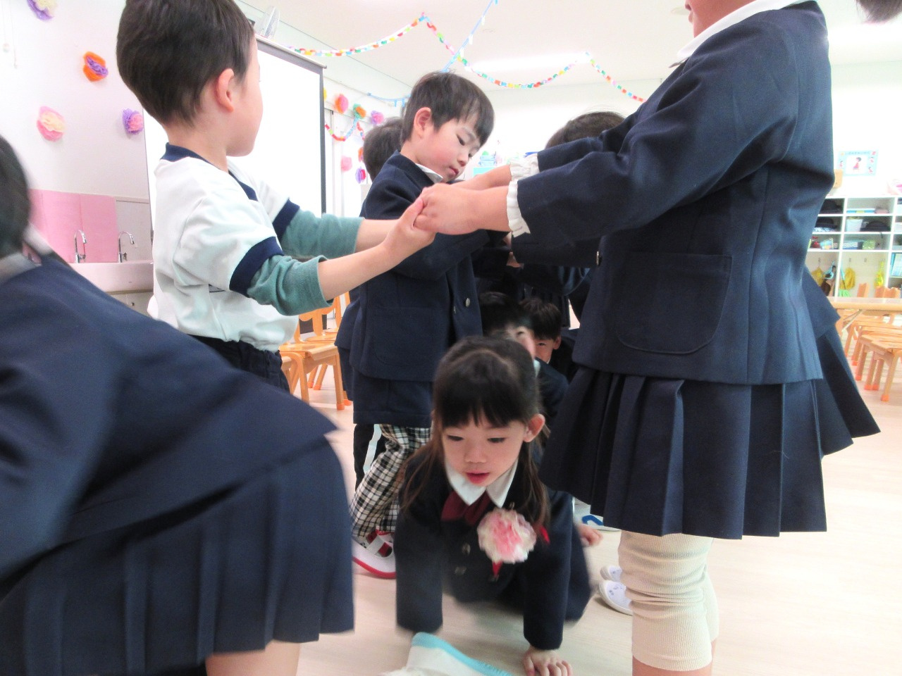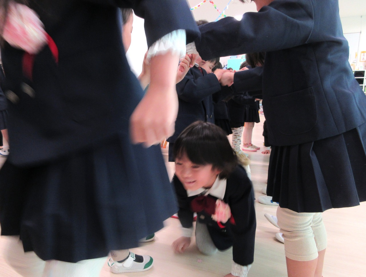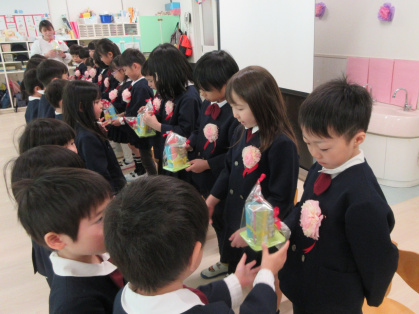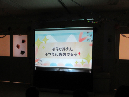 インタビューの後は、ぱんだ組さんときりん組さんから手作りのプレゼントをもらいました。みんな優しく『ありがとう』と言いながら嬉しそうにプレゼントを受け取りました。そして、ぞう組さんが入園してから卒園するまでの思い出のスライドショーをみんなで見ました。小さい頃の自分を見て「?」の顔をする子もいましたが、本当に大きくなりました。最後は、ぱんだ組さんときりん組さんが手をつなぎトンネルを作ってくれました。その間をニコニコ笑顔でくぐるぞう組さんでした。