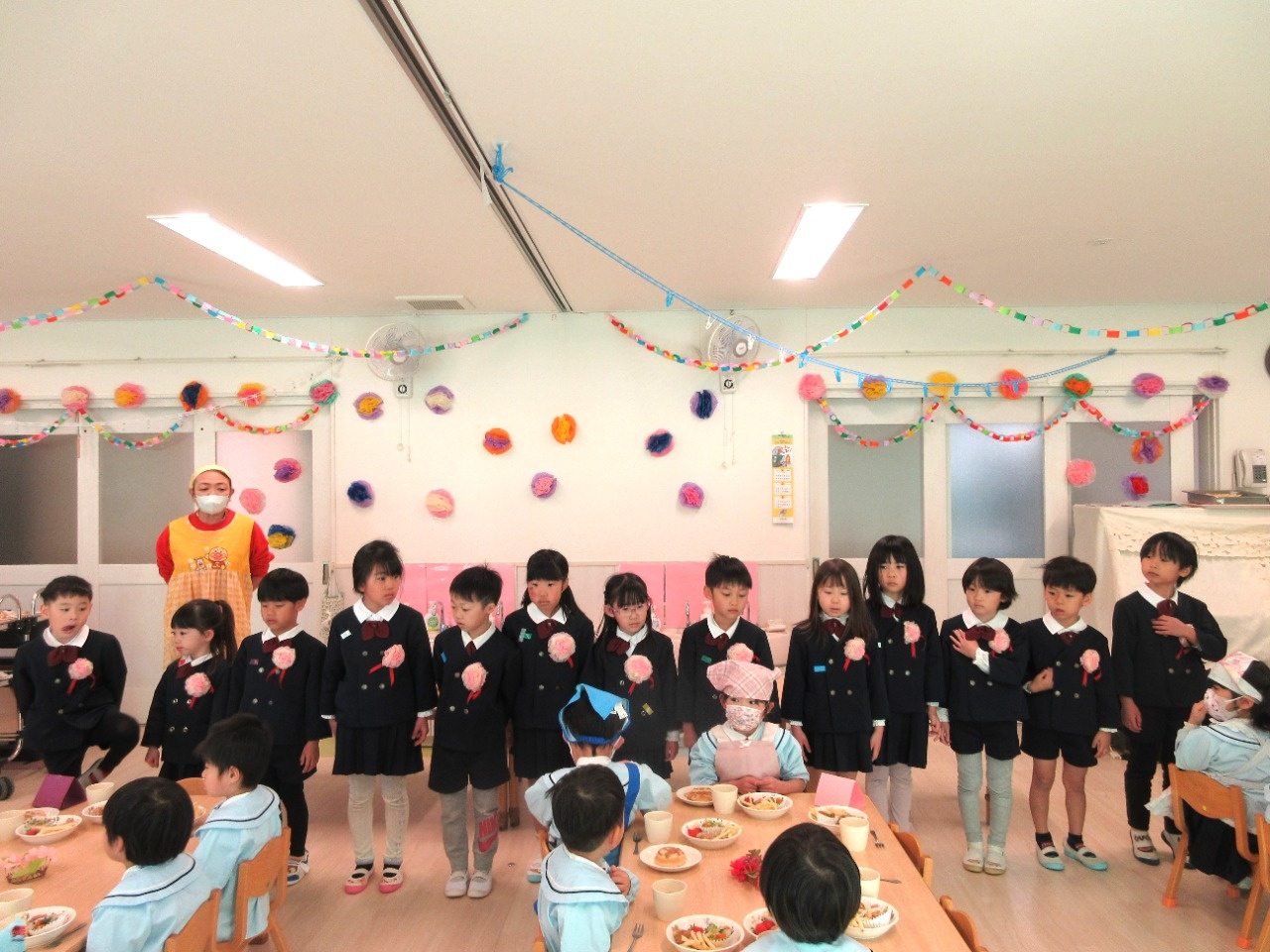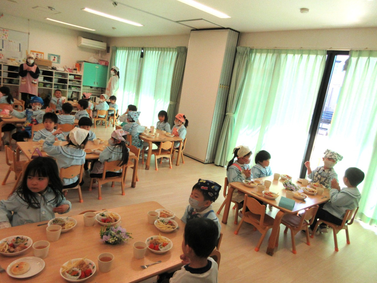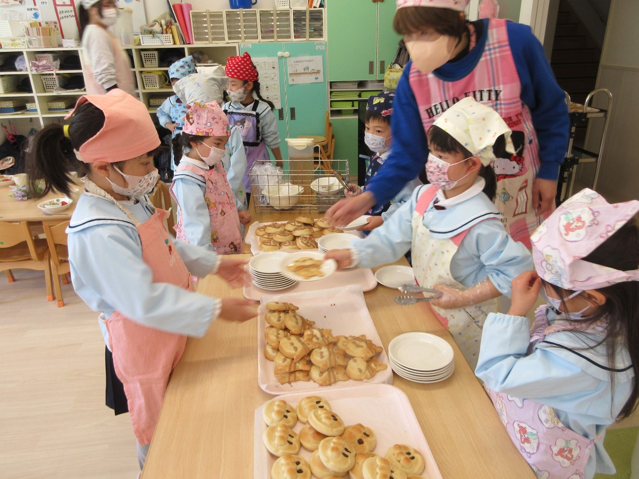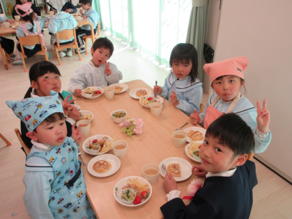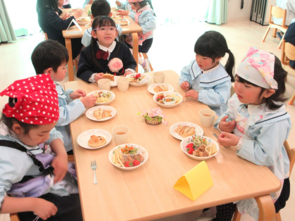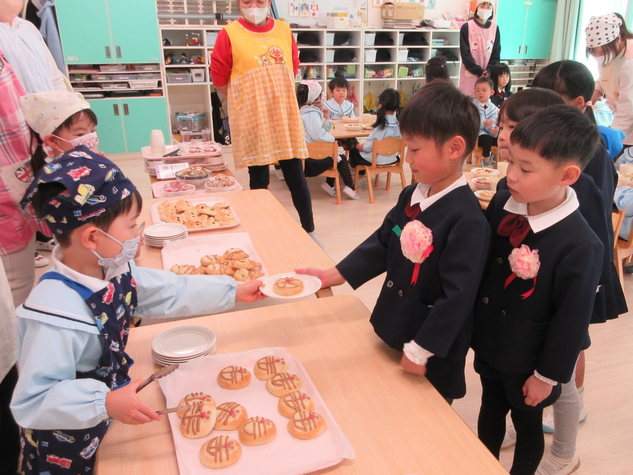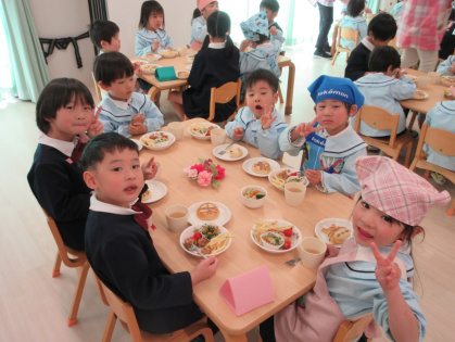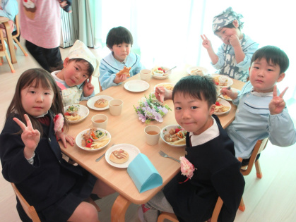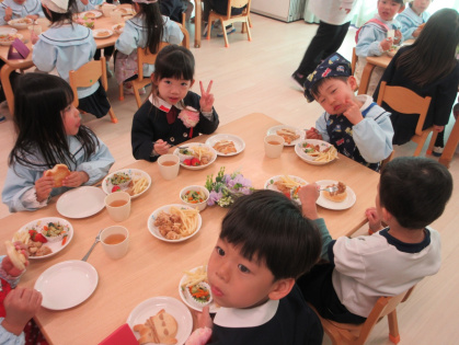 お別れ会の後は、幼児さんみんなと先生達で会食をしました。きりん組さんが中心となり、トングを使ってパンやおかずを皿に盛り付けをしたり、配膳をしてくれました。パンは、アンパンマン、ドラえもん、トトロの3種類があり、「どれにしようかなぁ?」と真剣に悩んでいる姿がとても可愛かったです。