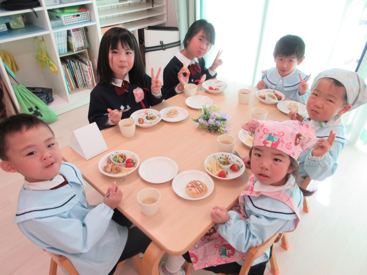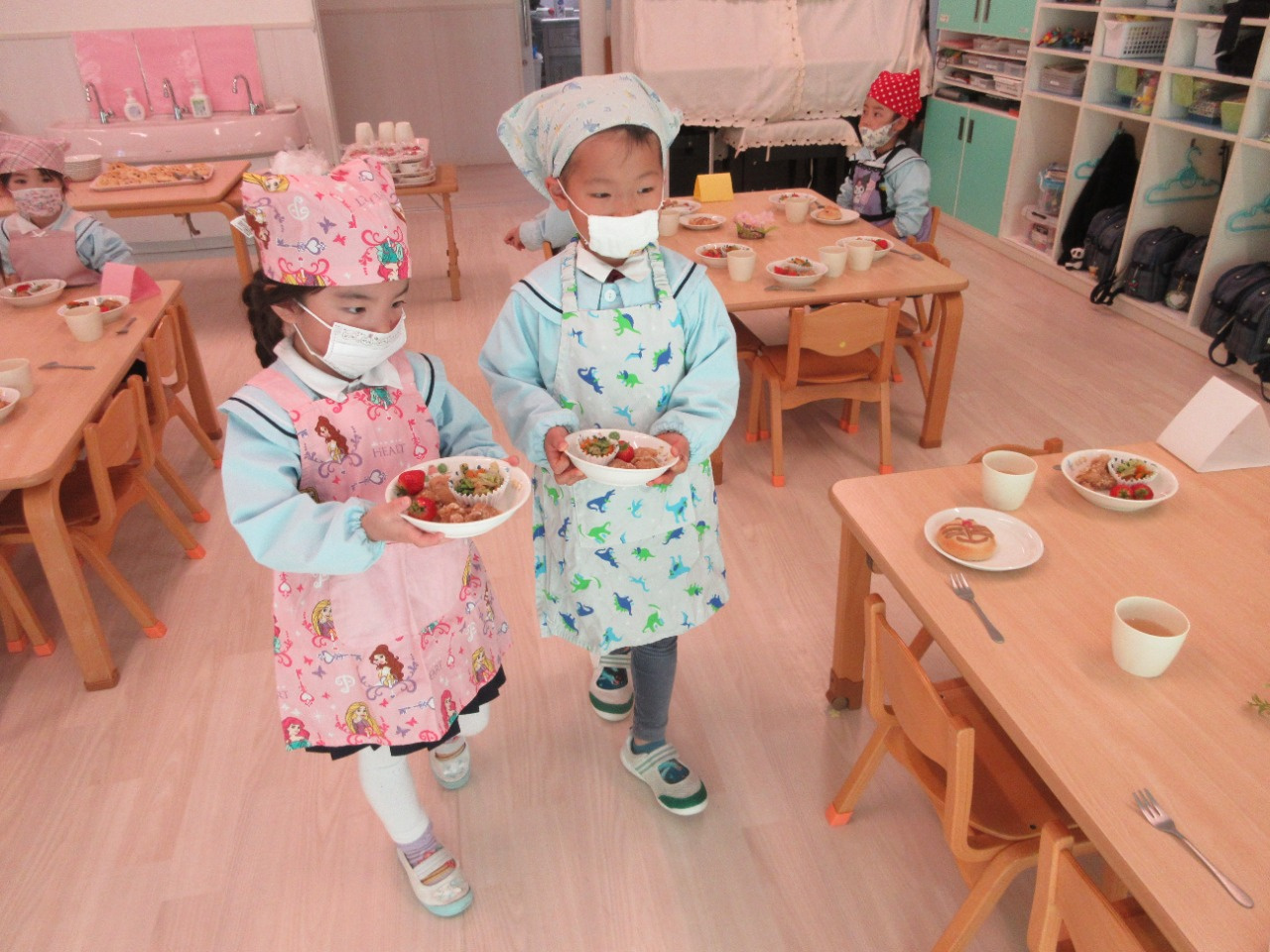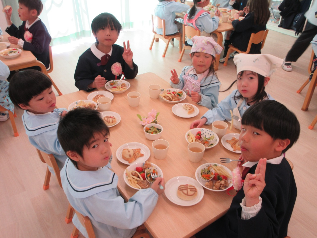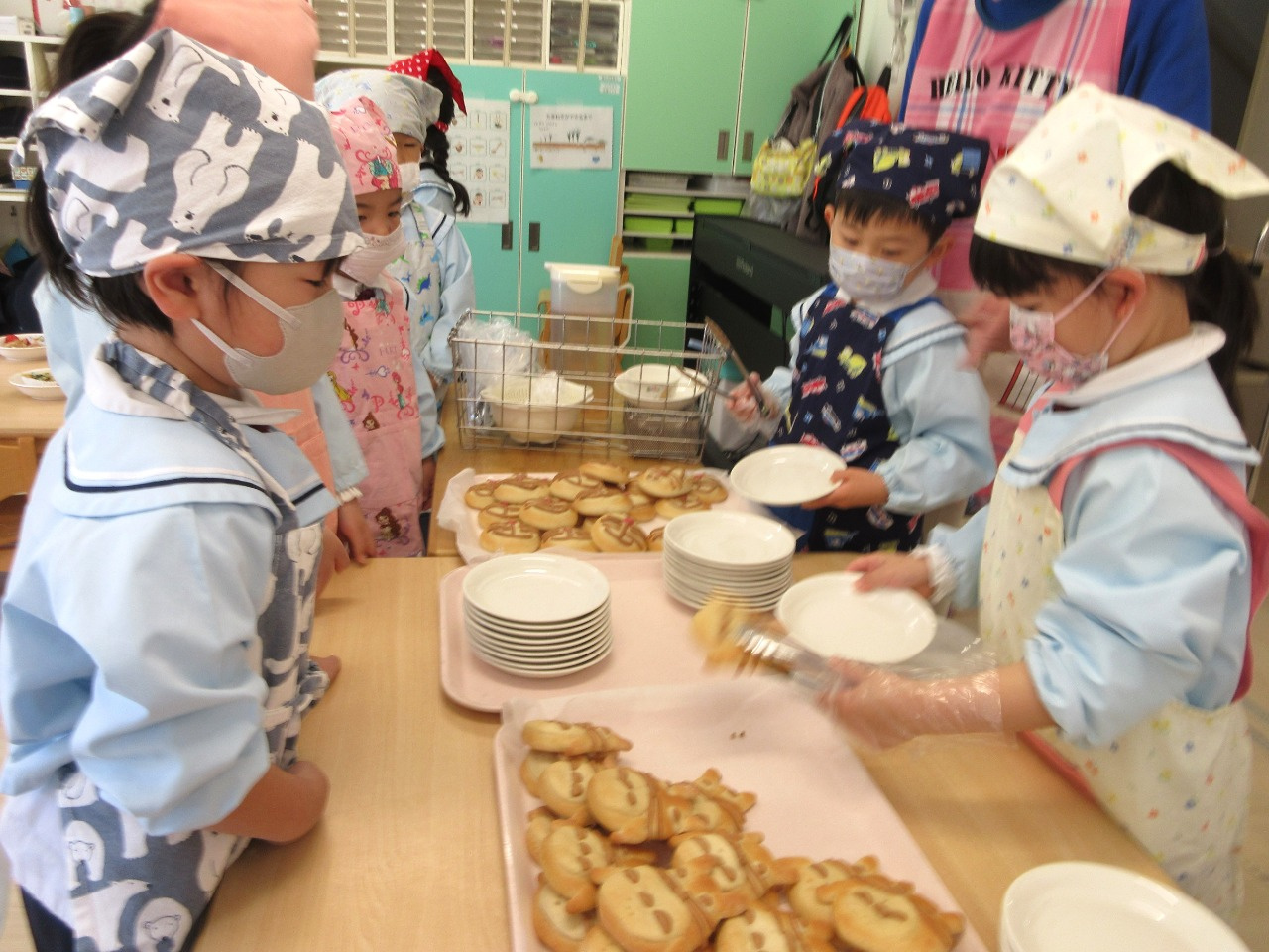 お別れ会の後は、幼児さんみんなと先生達で会食をしました。きりん組さんが中心となり、トングを使ってパンやおかずを皿に盛り付けをしたり、配膳をしてくれました。パンは、アンパンマン、ドラえもん、トトロの3種類があり、「どれにしようかなぁ?」と真剣に悩んでいる姿がとても可愛かったです。