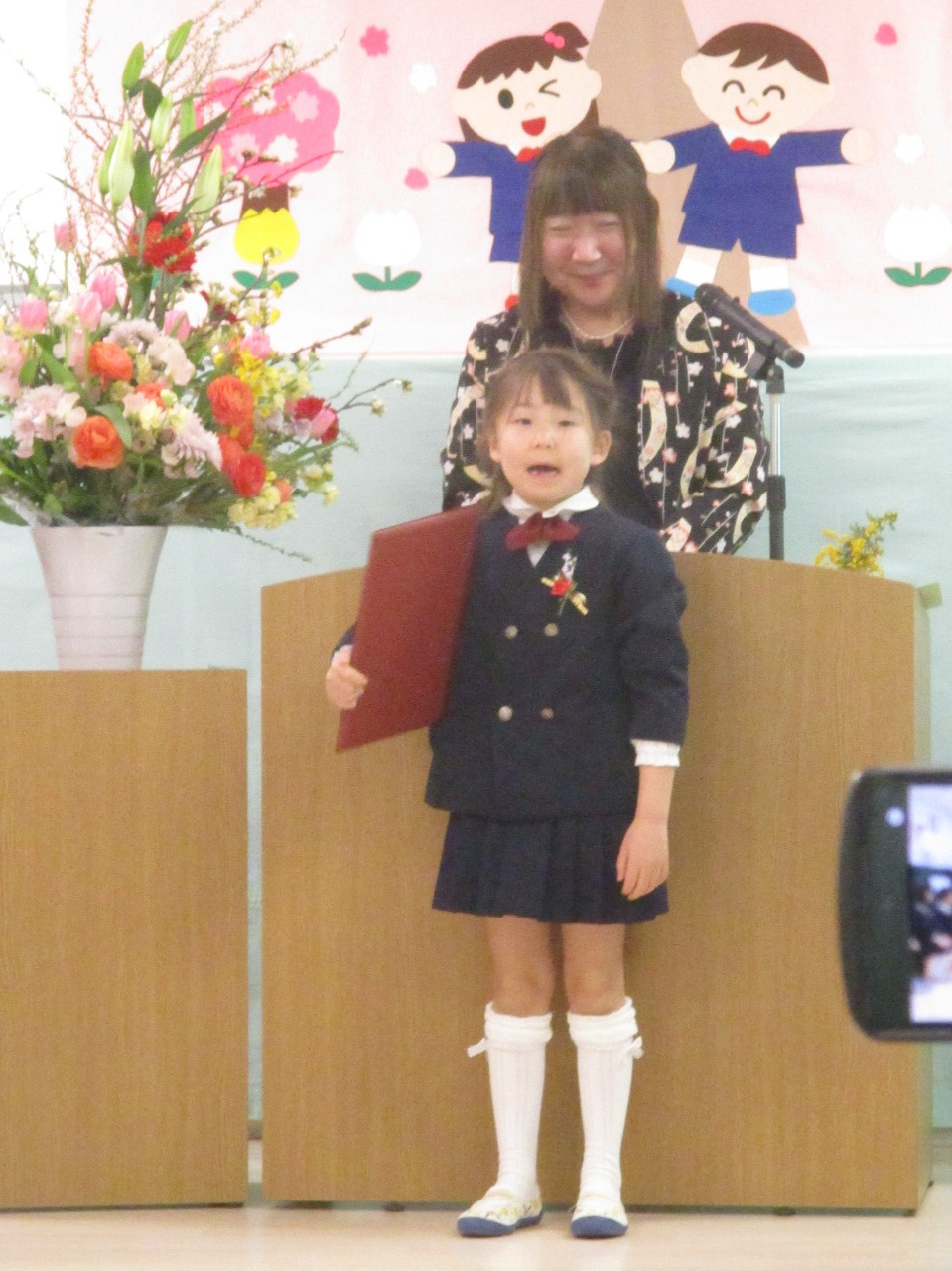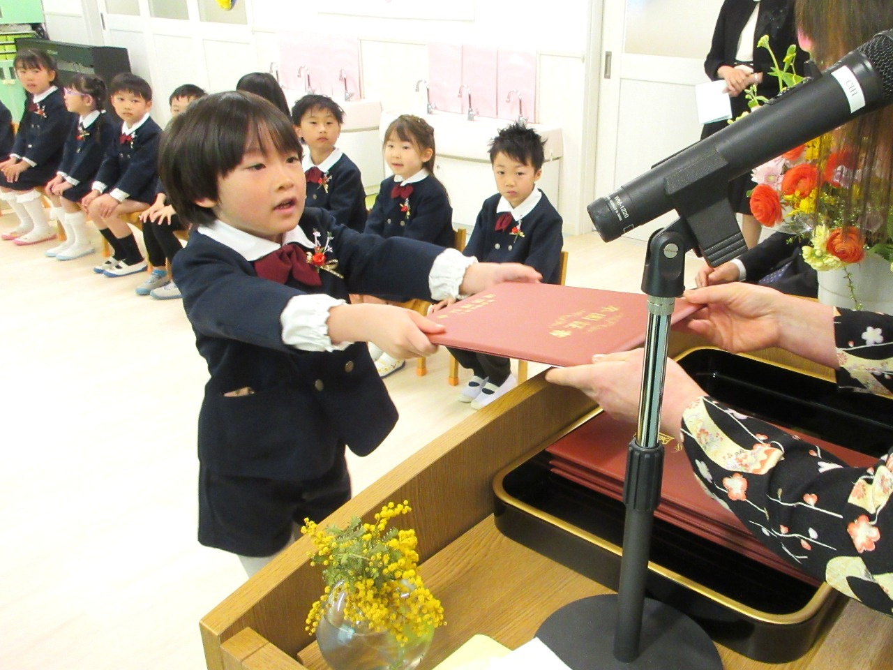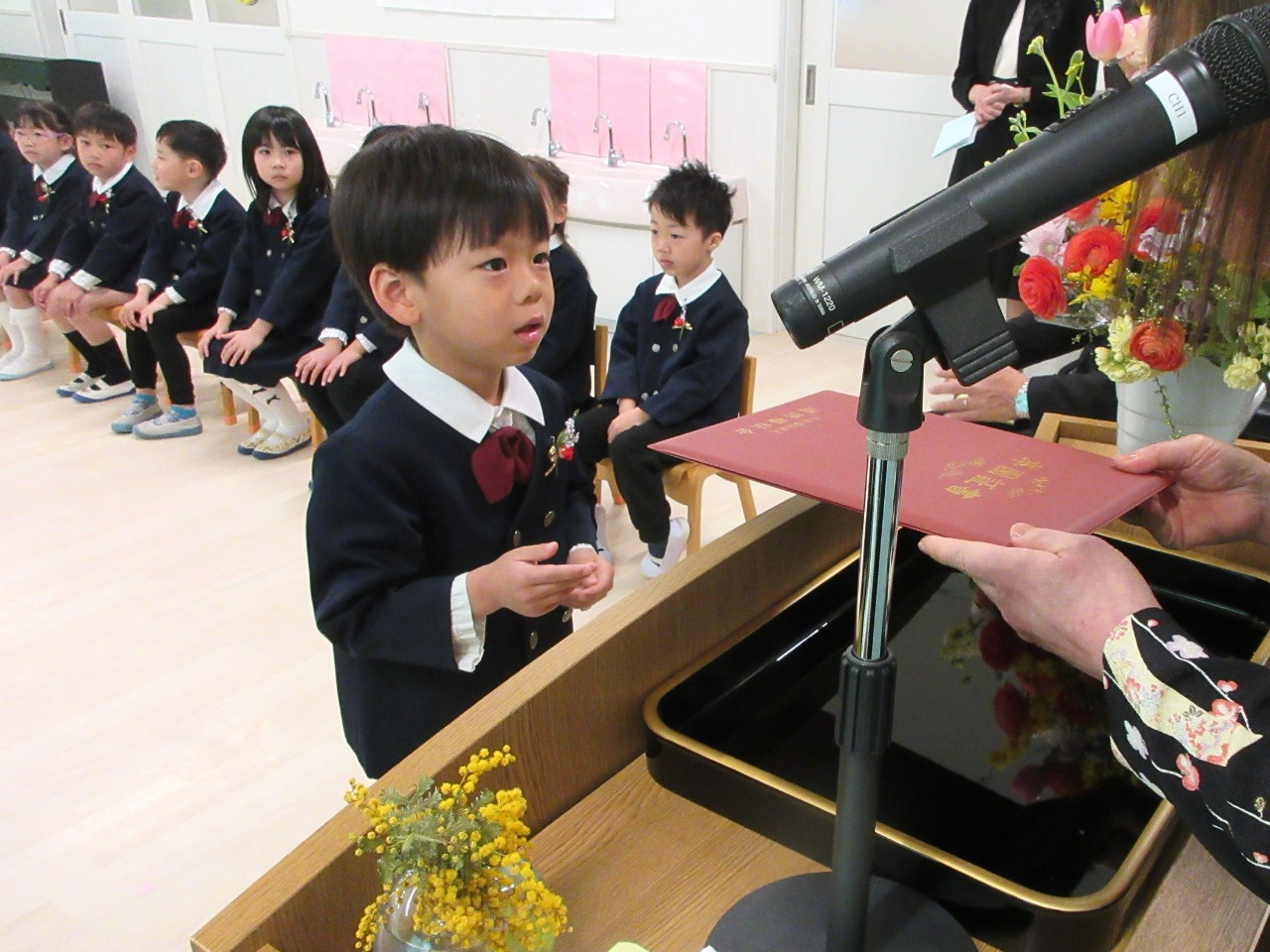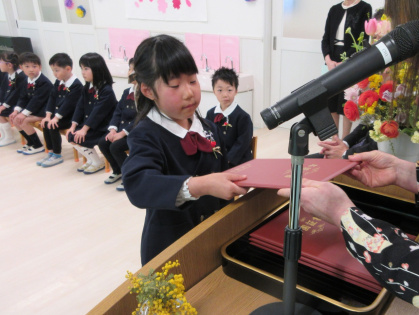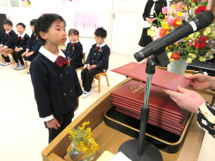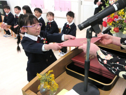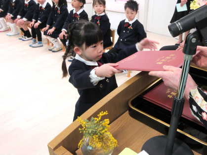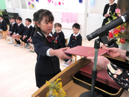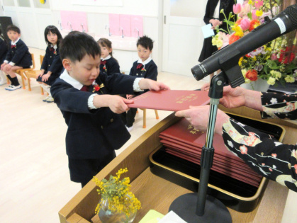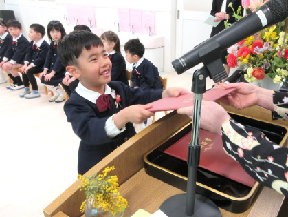 お祝いの言葉授与では、名前を呼ばれると「はい」と立ち、園長先生から卒園証書をいただきました。「おおきくなったら、〇〇になりたいです」と大きな声で発表した後、お父さんお母さんに「ありがとう」を伝え、証書を渡しました。