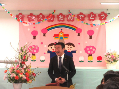 保護者の皆様が見守る中、少し緊張気味の様子で担任の先生と一緒に入場した子ども達。オーナーの松井良憲市会議員や園長先生からのお祝いの言葉では、とても真剣な表情で聞いていました。