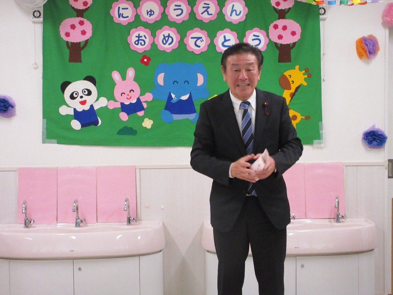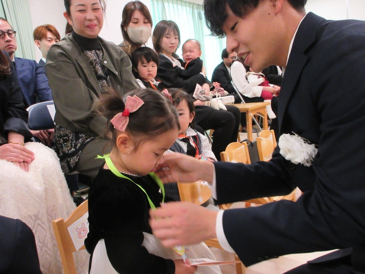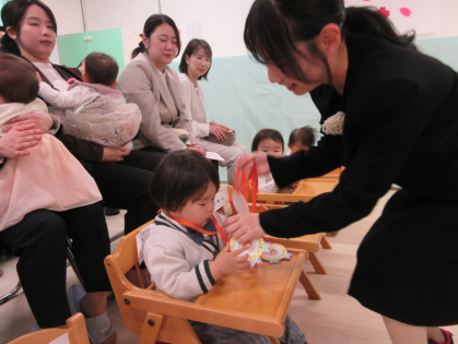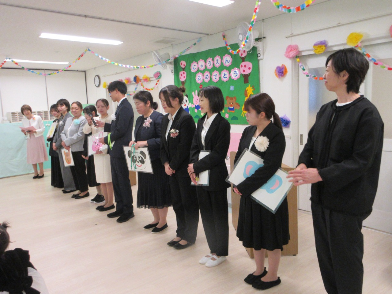 2026年04月04日(土) イベント報告 < お知らせ NEW 2026年度 入園式 入園おめでとうございます 4月4日(土)、しんもりやま保育園の入園式が行われました。今年度は、0歳児4名、1歳児6名、2歳児1名、3歳児2名、計13名のお友達が仲間入りをしました。みんなで楽しく遊びましょうね。 オーナーでもある松井市議のお話を頂戴後、園長先生のお話、職員紹介と新入園児紹介をしました。新入園児のお友達には、担任の先生から一人一人おめでとうペンダントを掛けてもらいました。